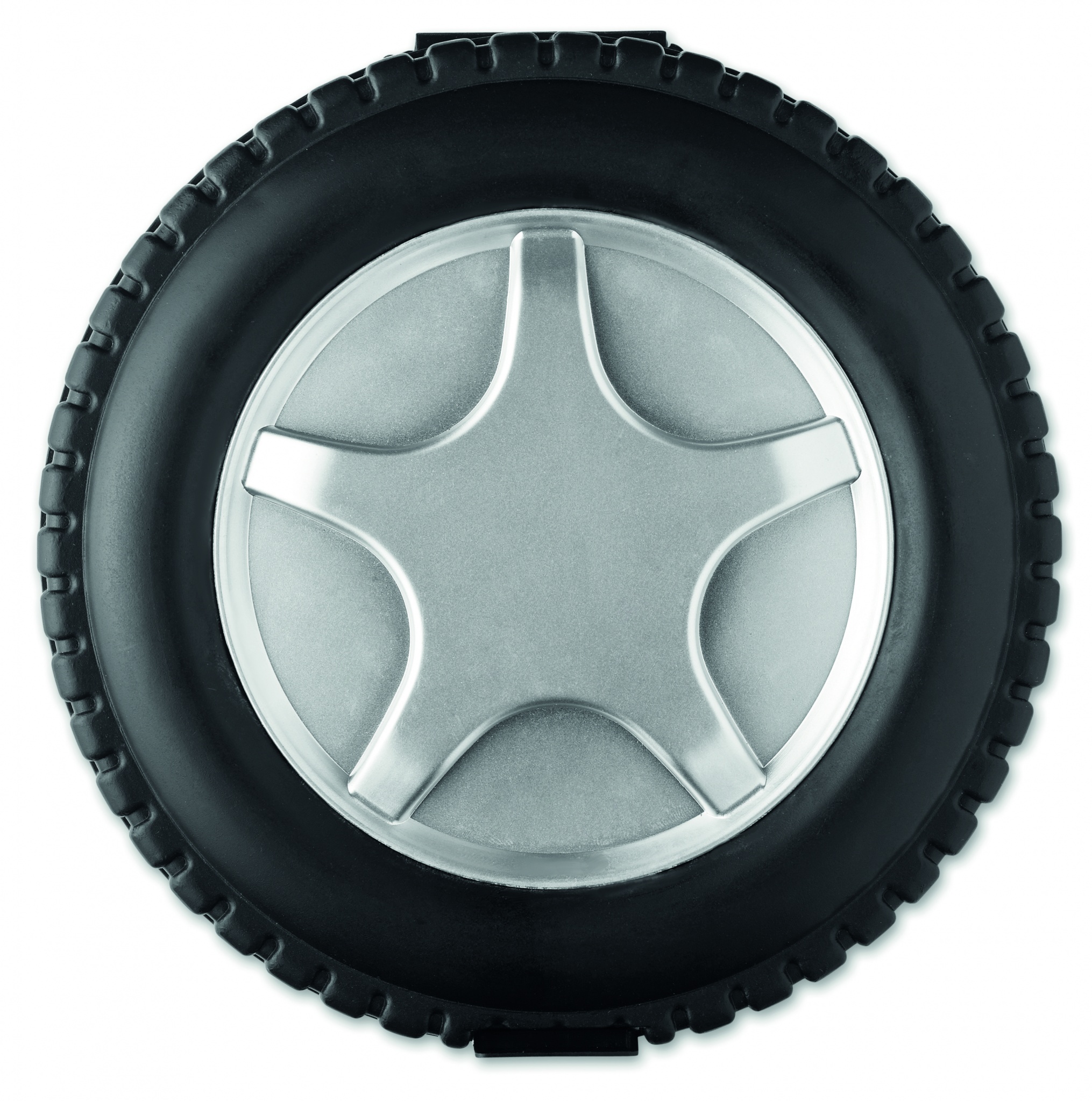 25-teiliges Werkzeug-Set in Form eines Autoreifens. Beinhaltet 1 Verlängerung, 1 Schraubenzieher, 1 Zange, 5 Fassungen, 3 Sechskantschlüssel, 10 Stück Bit-Satz, 2 Präzisionsschraubenzieher und 1 Maßband.