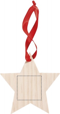 Anhänger aus Holz in Form eines Sterns. Mit rotem Aufhängeband.