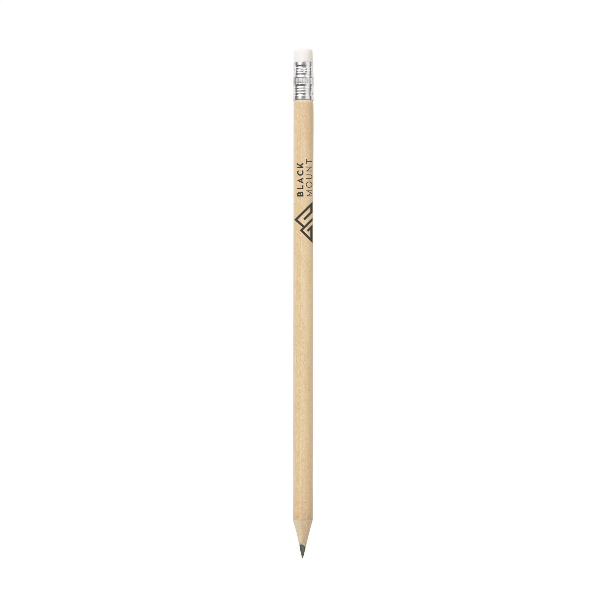 Angespitzter Holzbleistift (HB) mit Radiergummi.