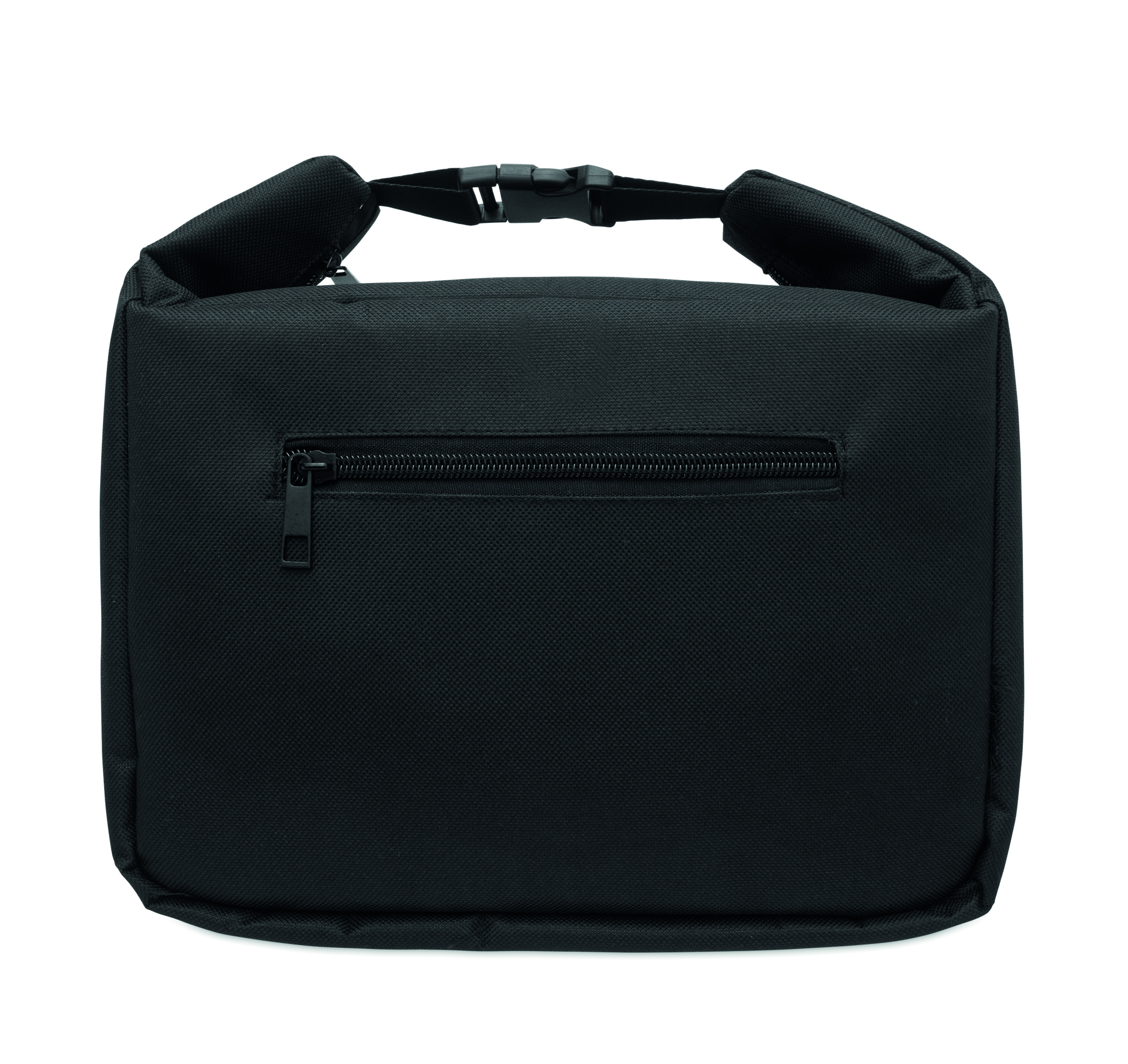 Kühltasche aus 600D RPET mit Anzeige der Innentemperatur. Hauptfach mit Reißverschluss. Seitliche Reißverschlusstasche, Steckverschluss. Isolierung: 3 mm PE-Schaum und Aluminiumfolie. Füllmenge: 10L.