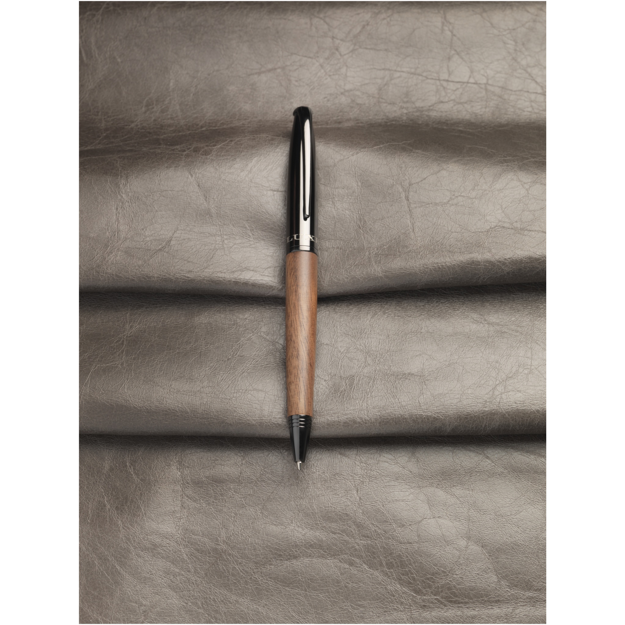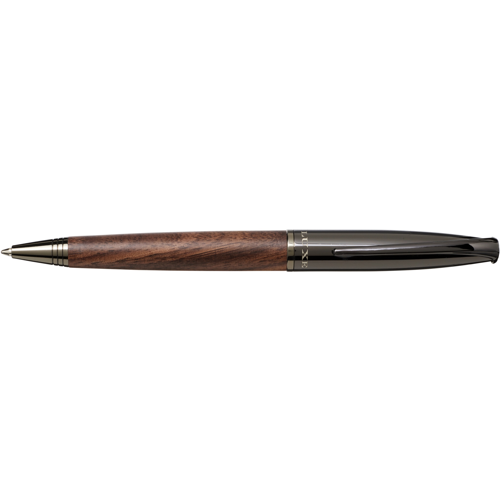Drehkugelschreiber mit Schaft in Holzoptik, aus verchromtem Messing, geliefert in einer Luxe-Geschenkbox. Kugelschreibergröße: 14,1 x 1,2 cm, Gewicht: 26 g, Schreiblänge: 1500 m.