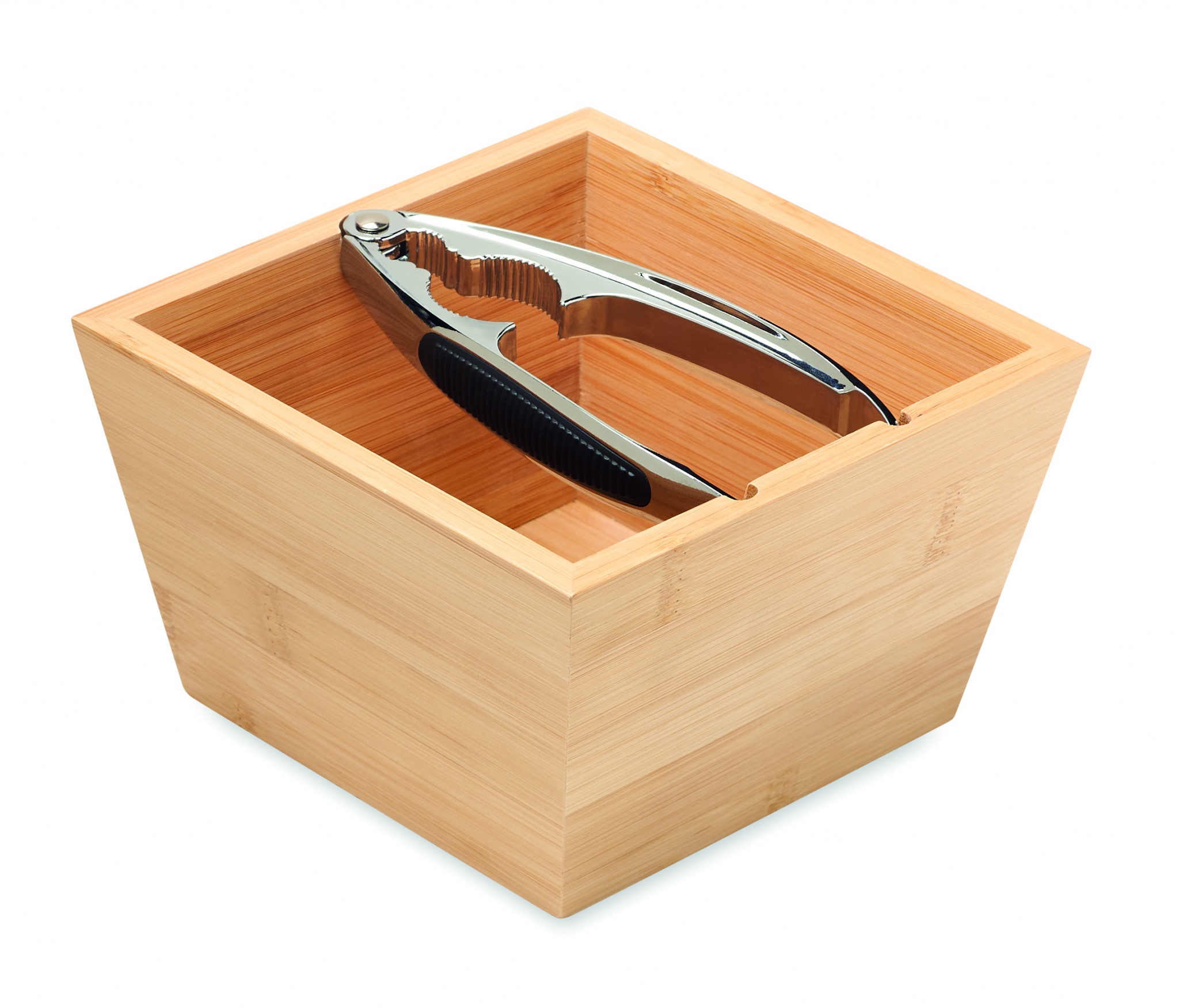 Nussknacker-Set mit silberfarbigem Nussknacker aus Zinklegierung mit TPR-Griff und einer Schale aus Bambus. Bambus ist ein natürliches Produkt, es kann daher zu leichten Abweichungen in Farbe, Dekor und Maßen kommen.