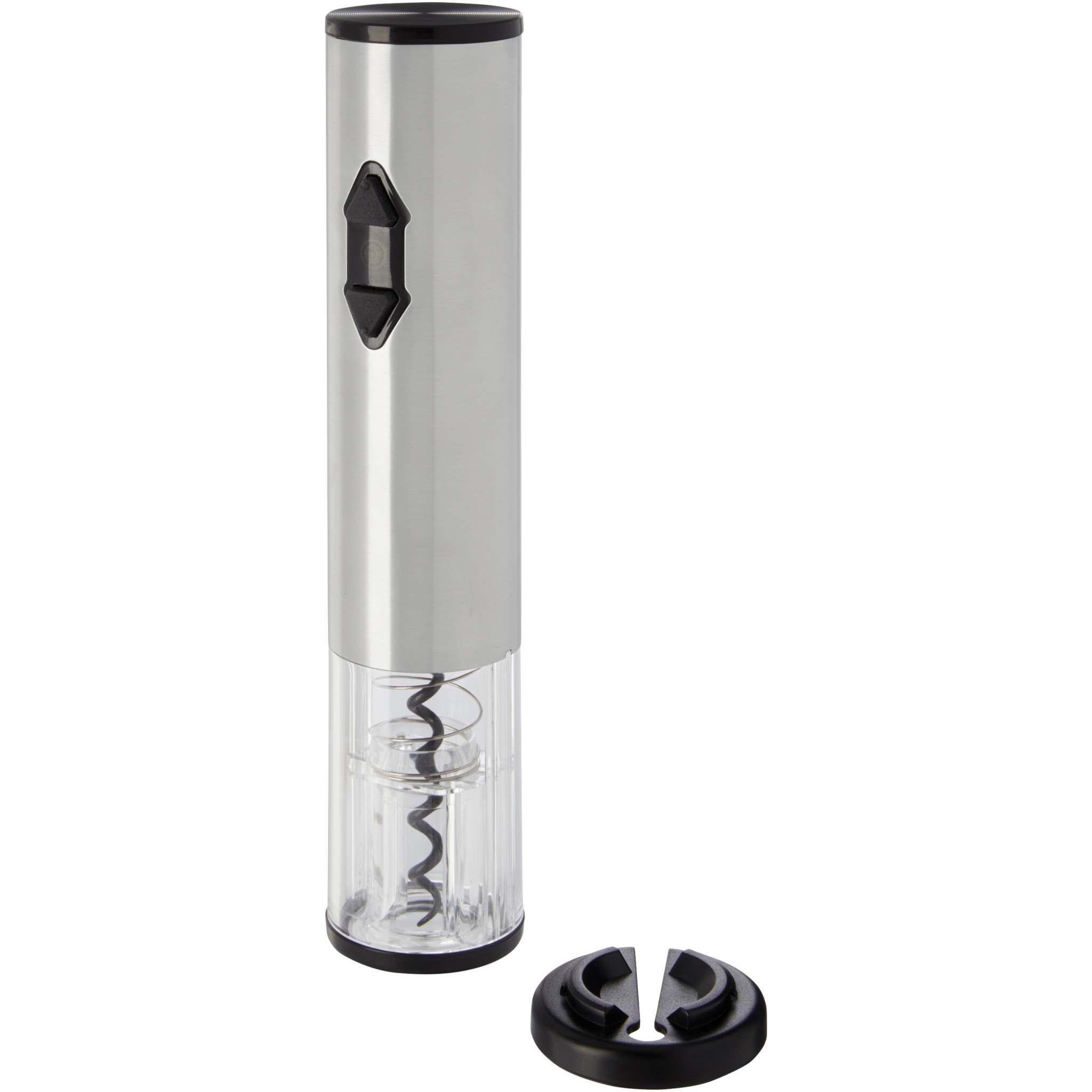 Elektrischer Korkenzieher in Kombination mit einem Kapselschneider, einem Ausgießer und einem Stopfen. Funktioniert mit 4 AA-Batterien (nicht im Lieferumfang enthalten).