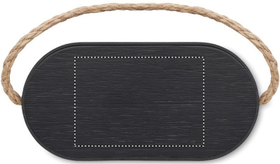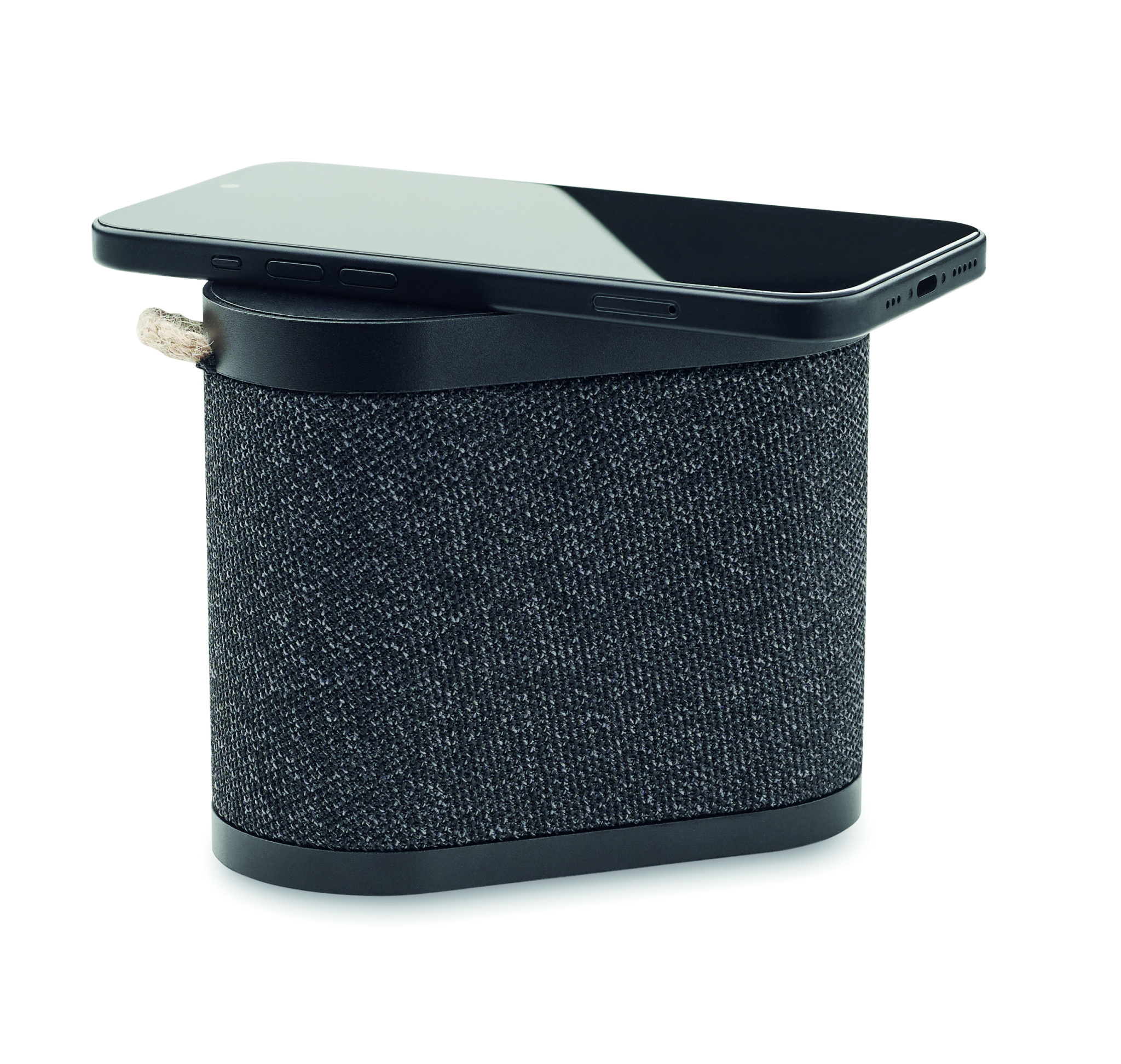 5.3 wireless speaker in ABS with RPET polyester fabric finish and bamboo 15W wireless charger top, with jute handle. 1 Rechargeable Li-Ion 1200 mAh battery. Output data: 5W, 4 Ohm and 5V. Playing time approx. 4h.