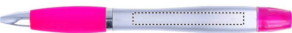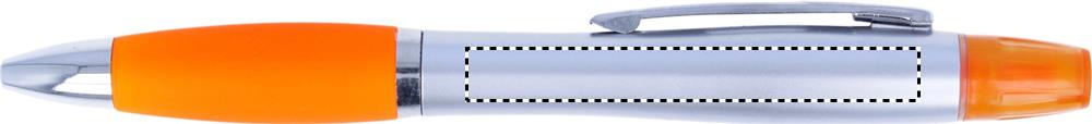 2 in 1 plastic ball pen and highlighter in silver satin finish and chromed fittings. Blue ink.