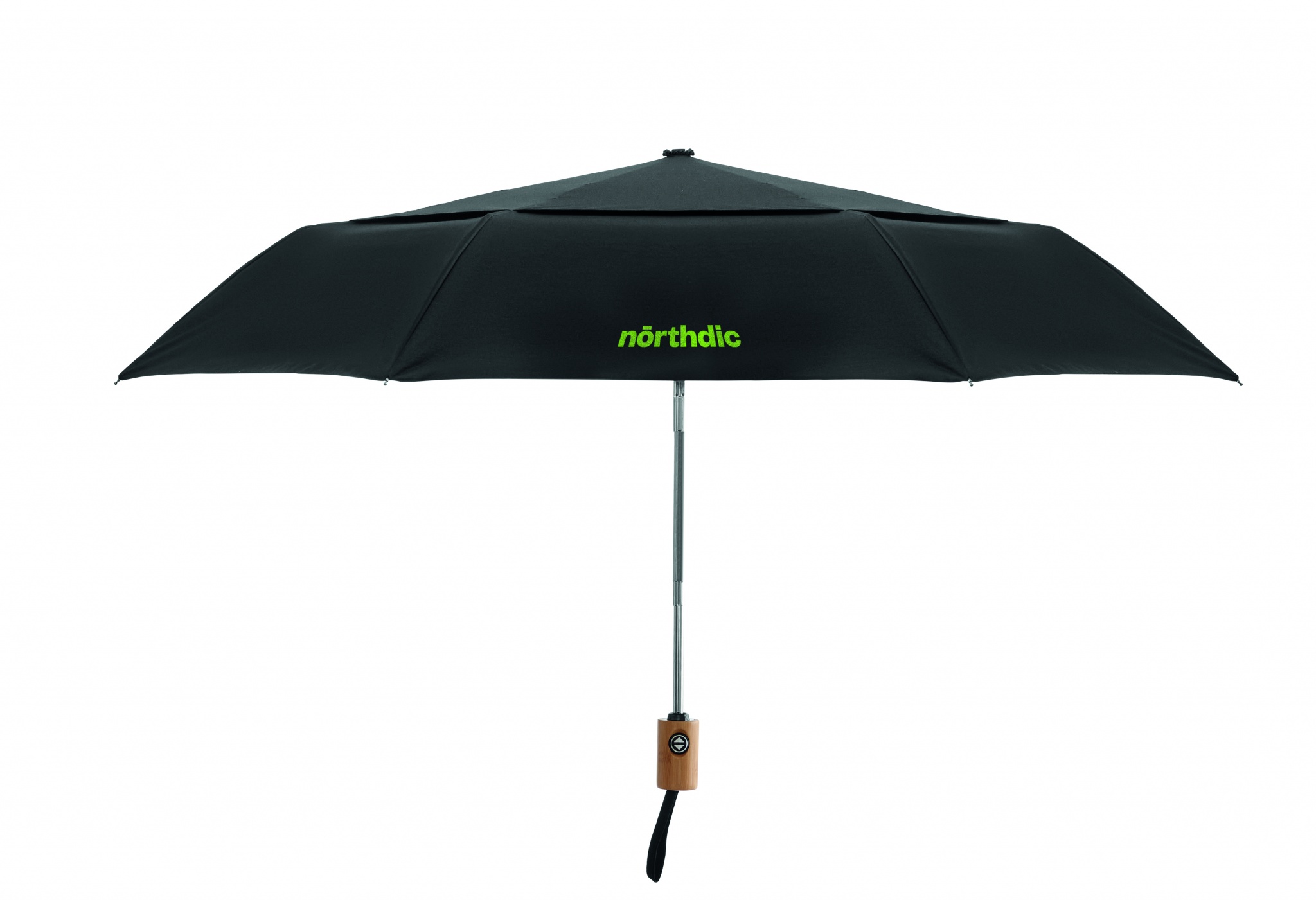 21 inch 2 fold auto open windproof umbrella in 190T polycotton (70% polyester and 30 % cotton) material with full aluminium shaft, tips and bamboo handle. Black fiberglass ribs. Includes matching pouch. Automatic closure.