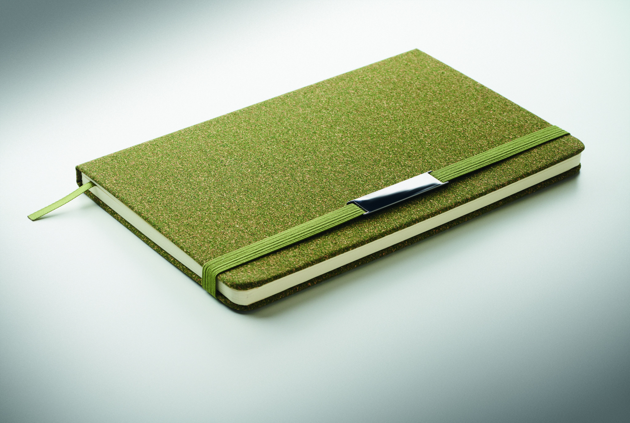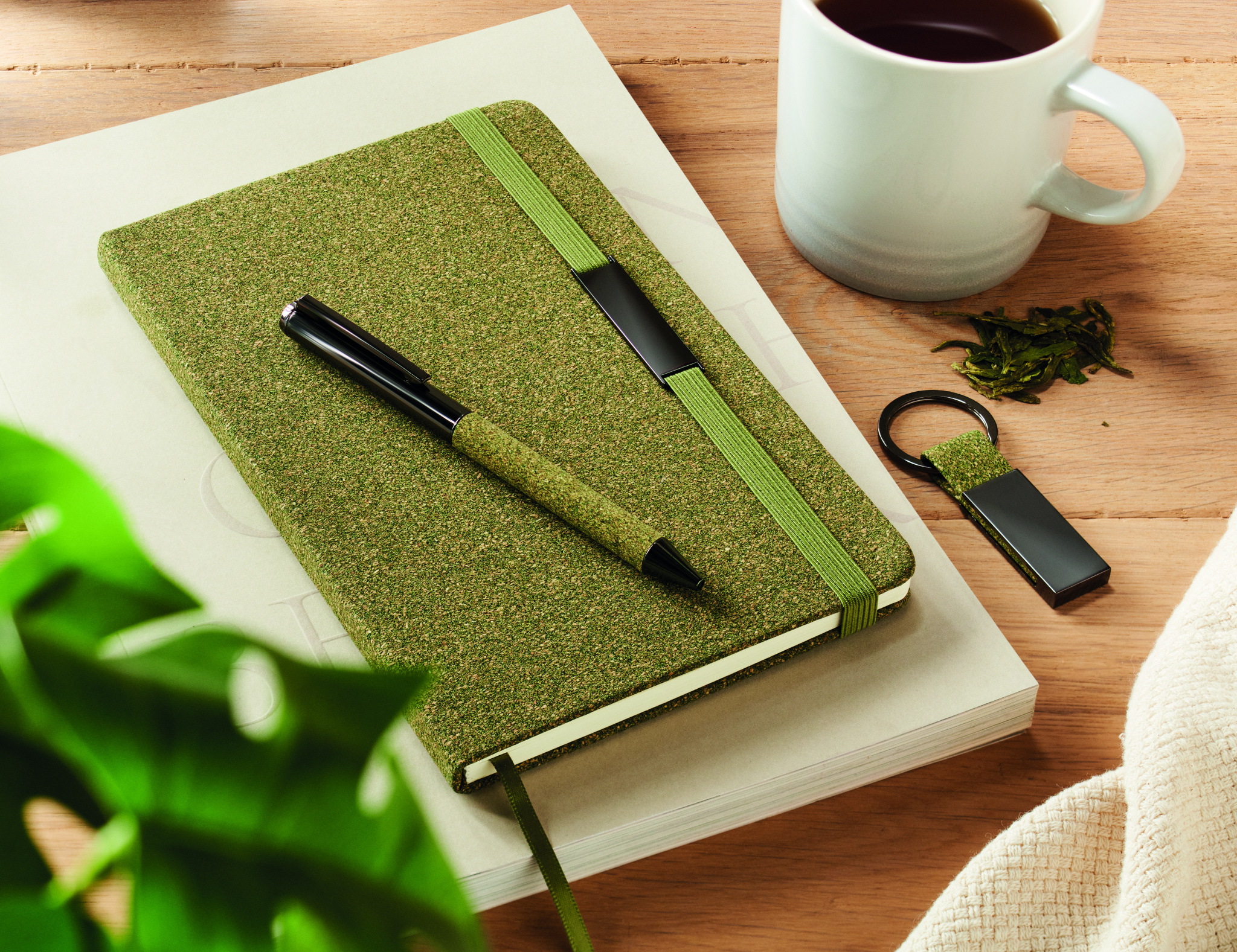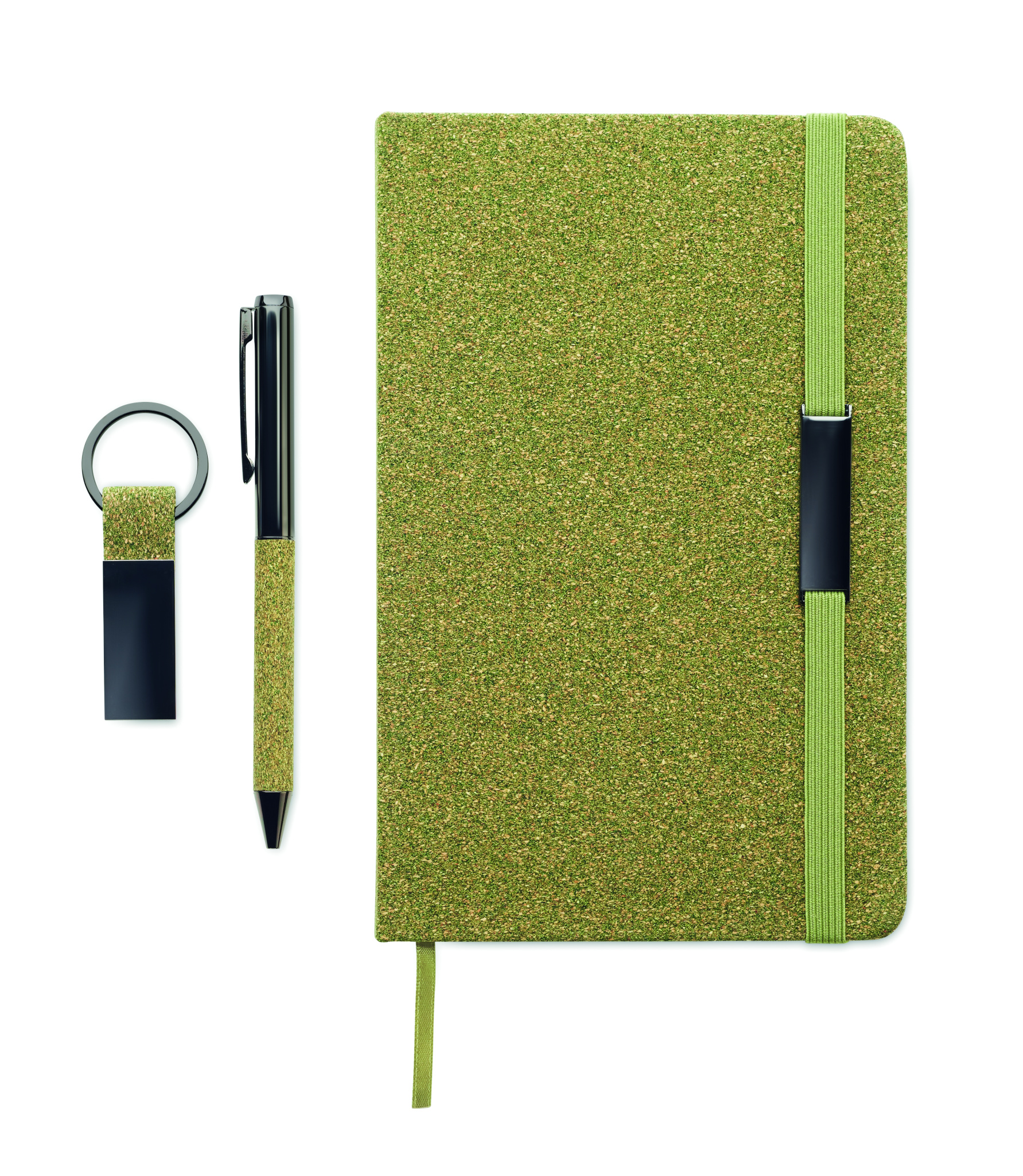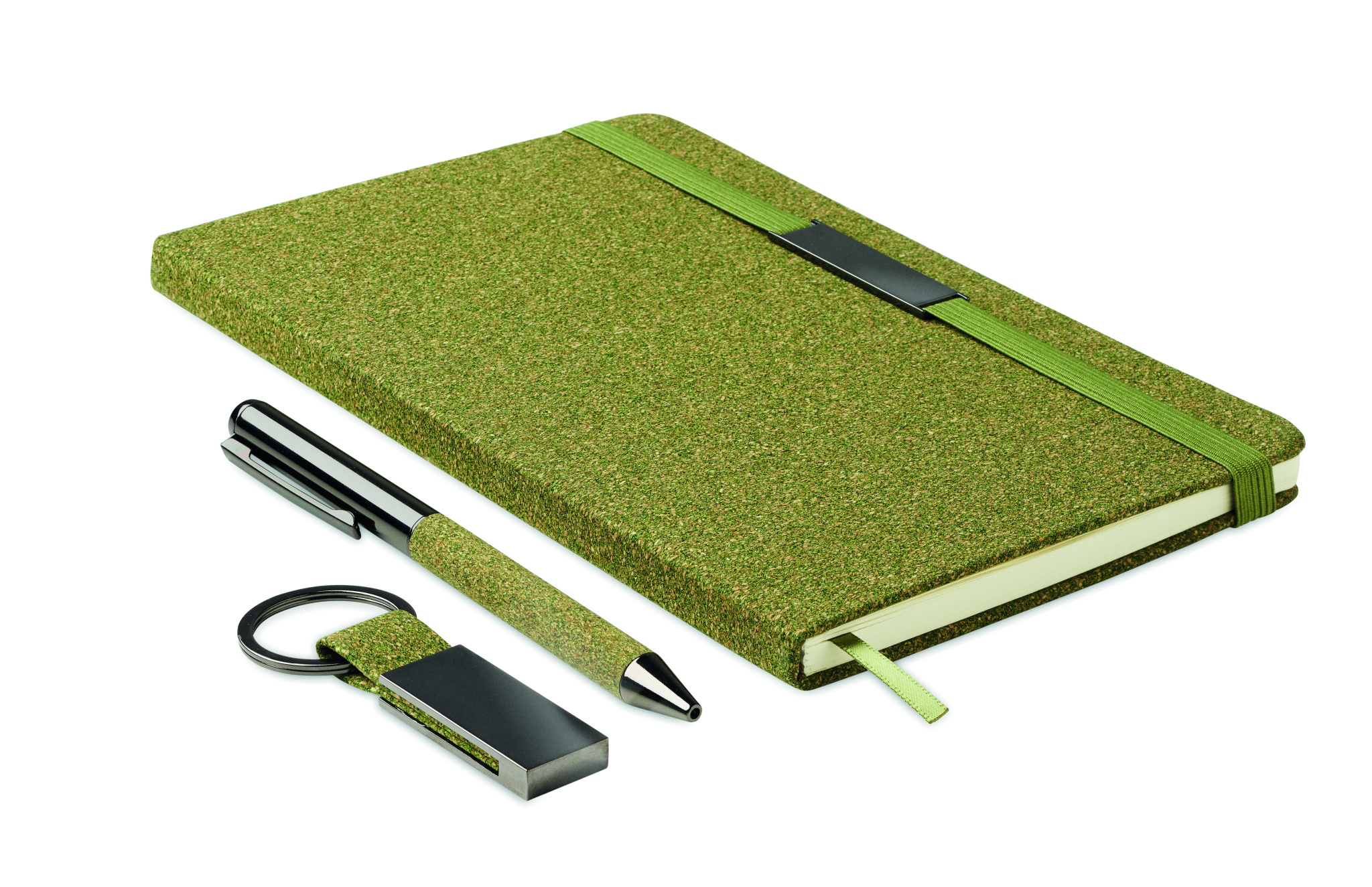 Set of hard cover A5 notebook 160 lined recycled paper pages (80 sheets/70 gsm), twist metal ballpen and keyring. Detail made of 20% tea grounds, 30% cork, 50% polycotton cloth. Metal detail on elastic strap. FSC®-certified | FSC MIX CREDIT, N7.1, FSC-C213206
