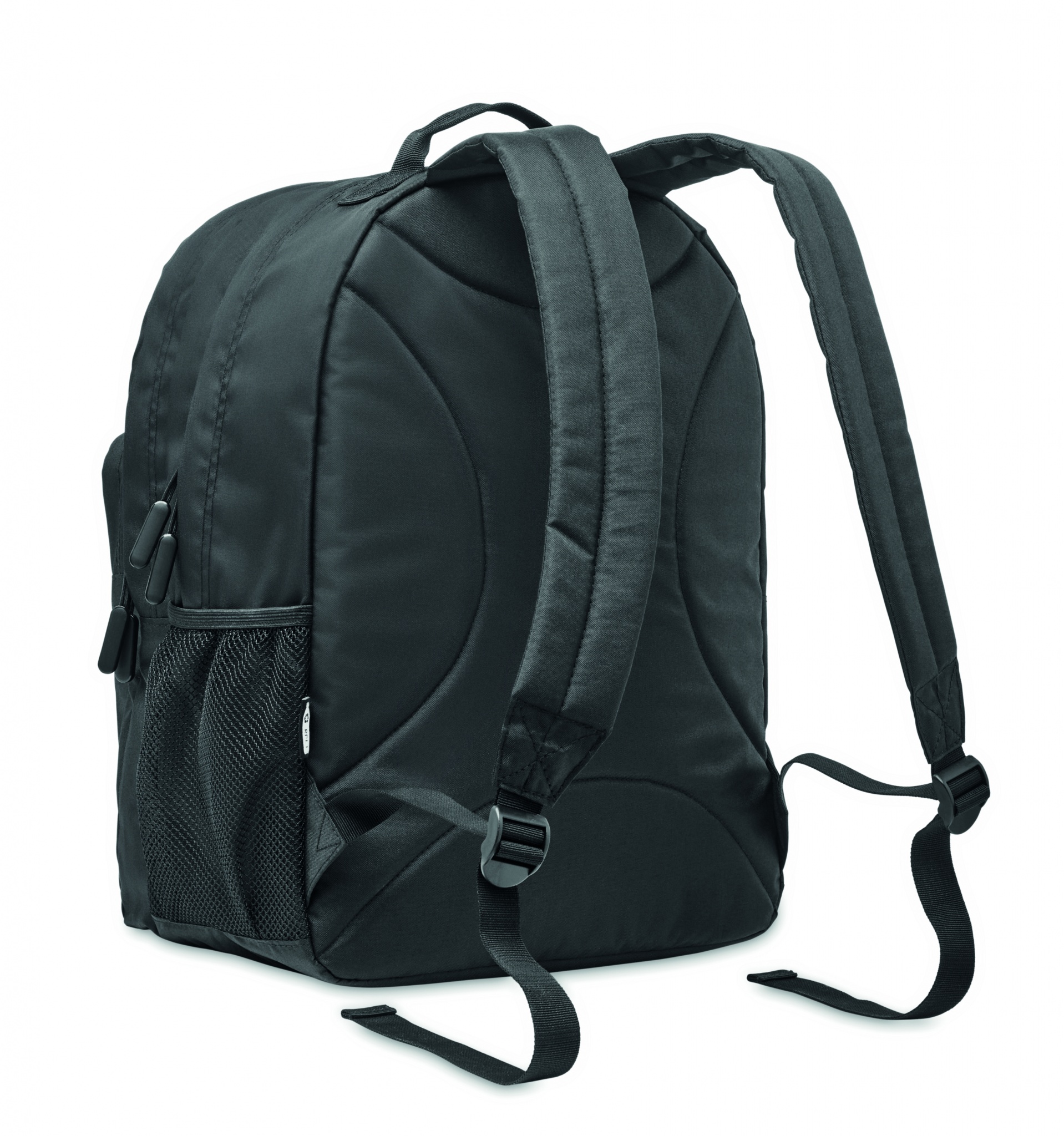 15 inch laptop backpack in 300D RPET polyester. It has 2 large zippered compartments, double zippered front pockets and mesh side pocket. Padded back, bottom and shoulder straps.