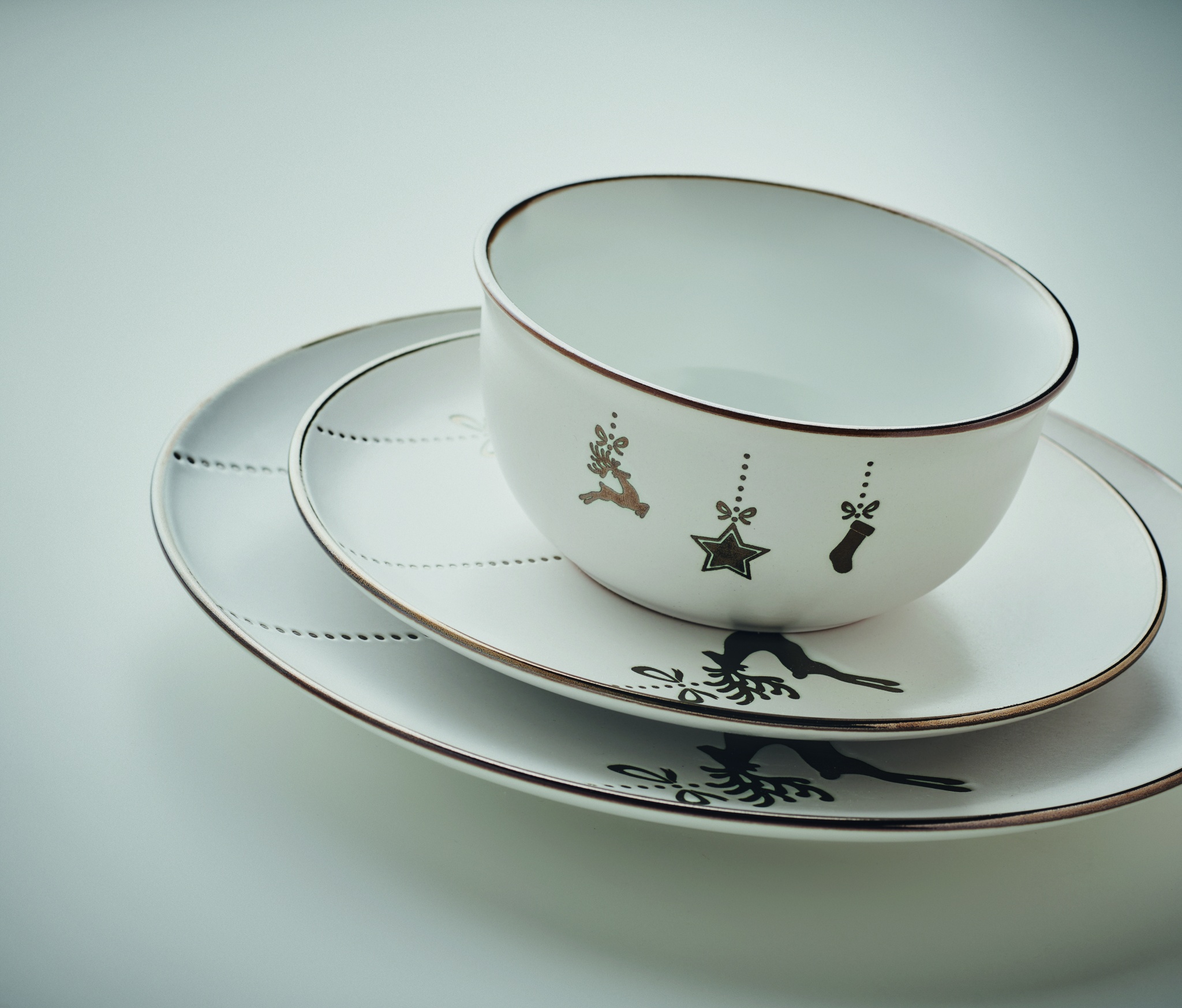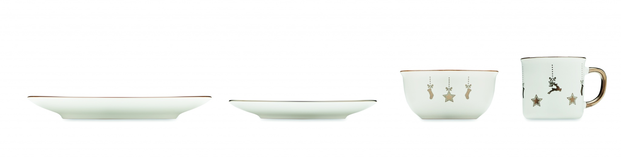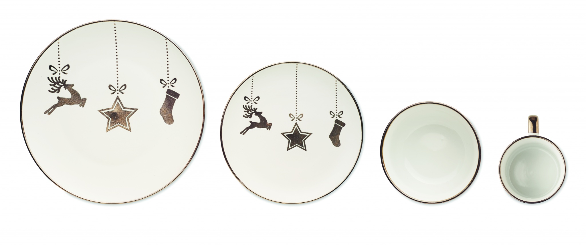 Christmas 4 piece ceramic place setting. Including: dinner plate, breakfast plate, cereal/salad bowl (500 ml) and mug (300 ml). Presented in a gift box.
