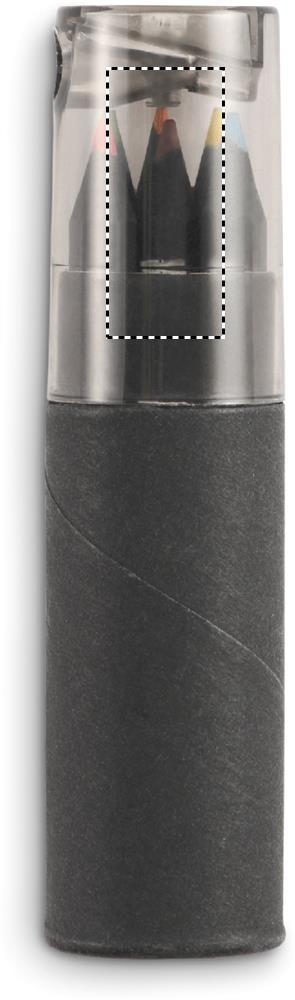 Black coloured paper tube box contains 6 colouring pencils and a pencil sharpener in the lid of the box.