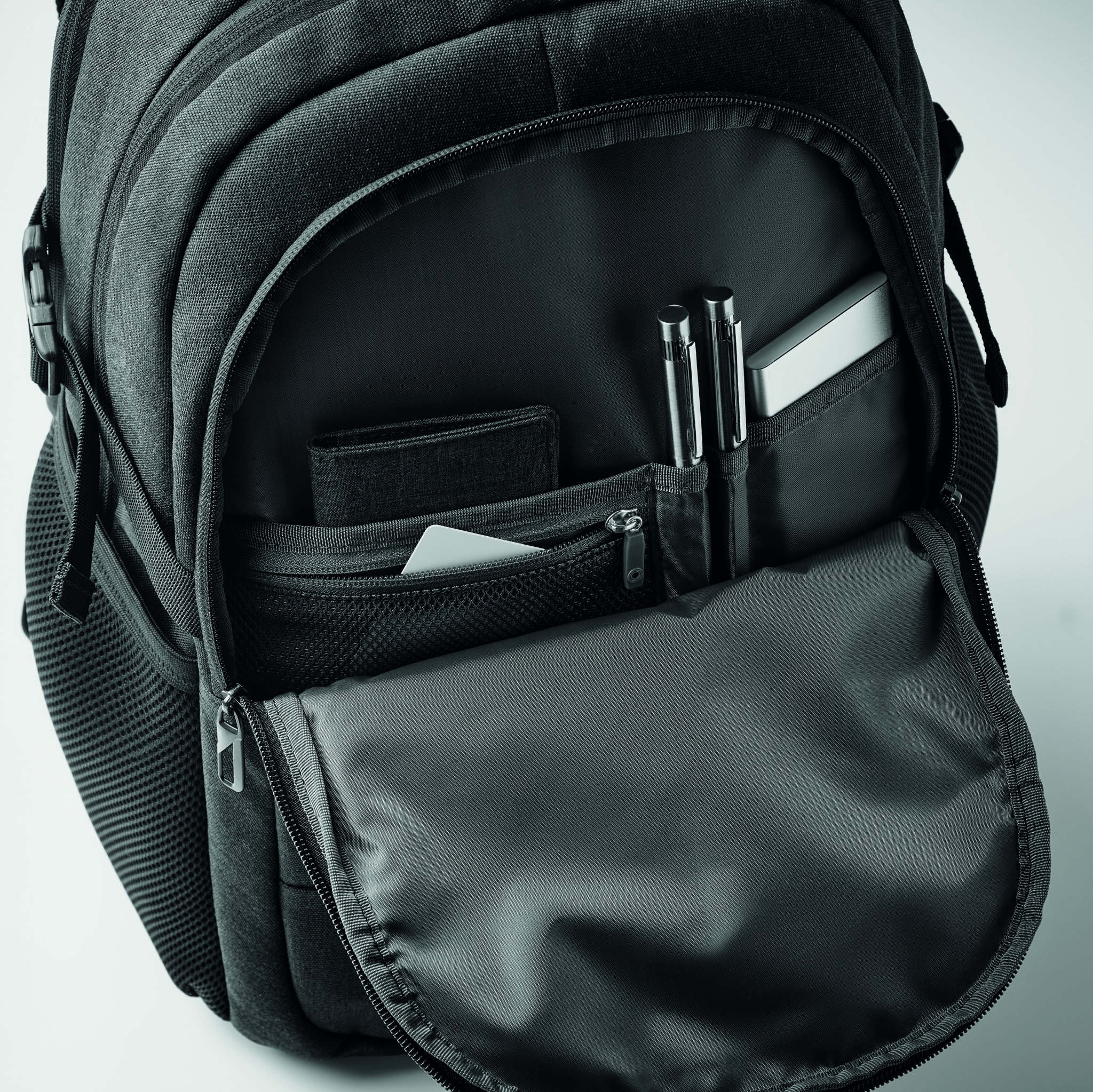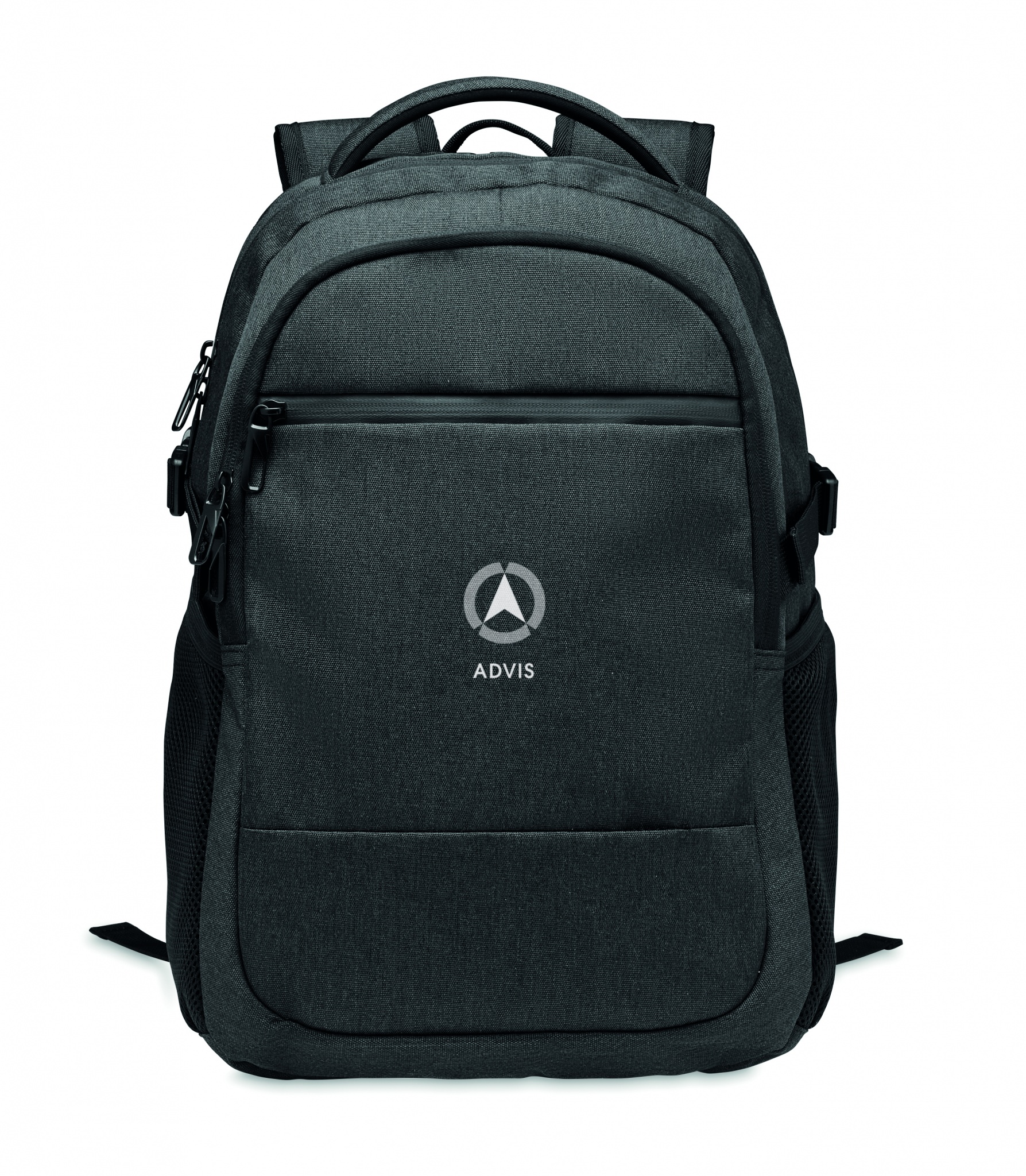 15 inch laptop backpack in 600D RPET polyester. 3 large zippered external compartments fully padded with several inside pockets. It has two mesh side pockets. Adjustable shoulder straps. Padded mesh airflow and trolley holder on reverse side.