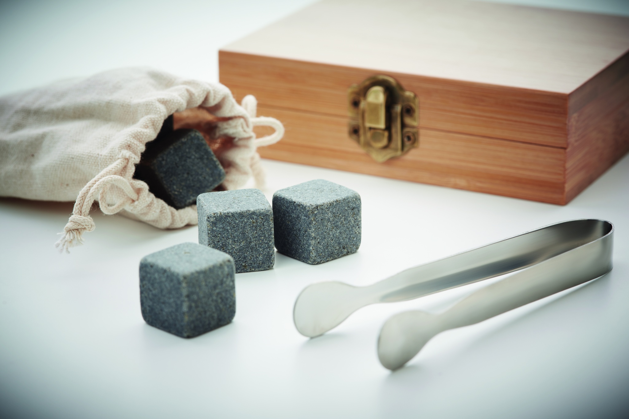 Reusable stone set in bamboo gift box. Includes 9 reusable stone ice cubes with storage cotton pouch and tongs. Bamboo is a natural product, there may be slight variations in colour and size per item, which can affect the final decoration outcome.