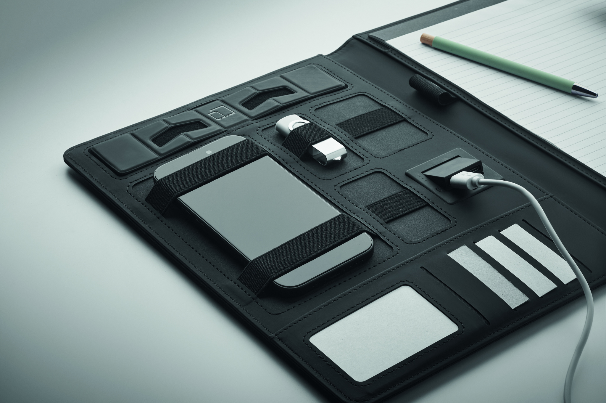 A4 conference folder with linen-PU cover. 5000 mAh power bank and 15W magnetic wireless charger. 20 lined sheets notepad. Multiple internal compartments. Magnetic closure. Elastic pen holder.