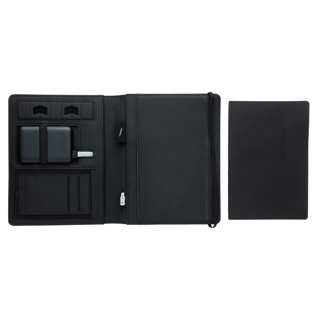 This notebook cover allows you to have your meetings in style. The front cover has a wireless charging pad for your smartphone. (Android latest generations, iPhone 8 and up). Older phones and tablets can be charged via the USB ports with the external 5.000 mAh powerbank. Input: 5.0V/2.1A. Output 1: 5.0V/2.1A. Output 2: 5.0V/2.1A.Wireless Output: 5W. Registered design®