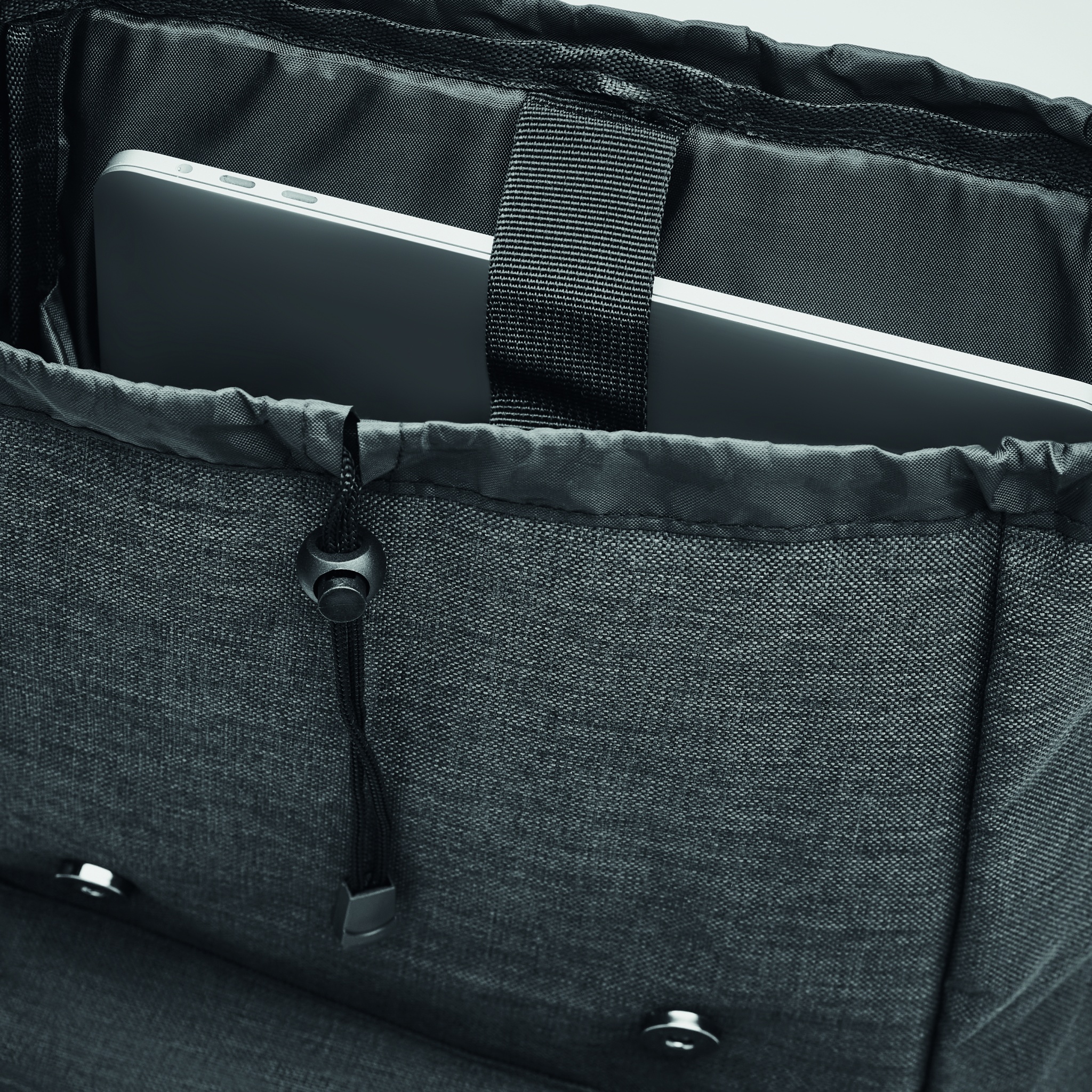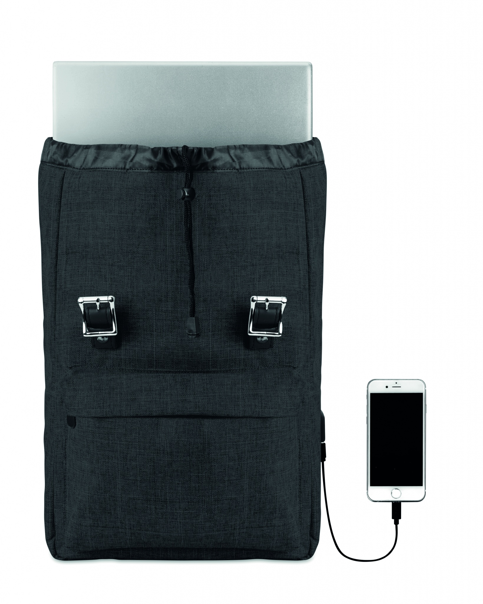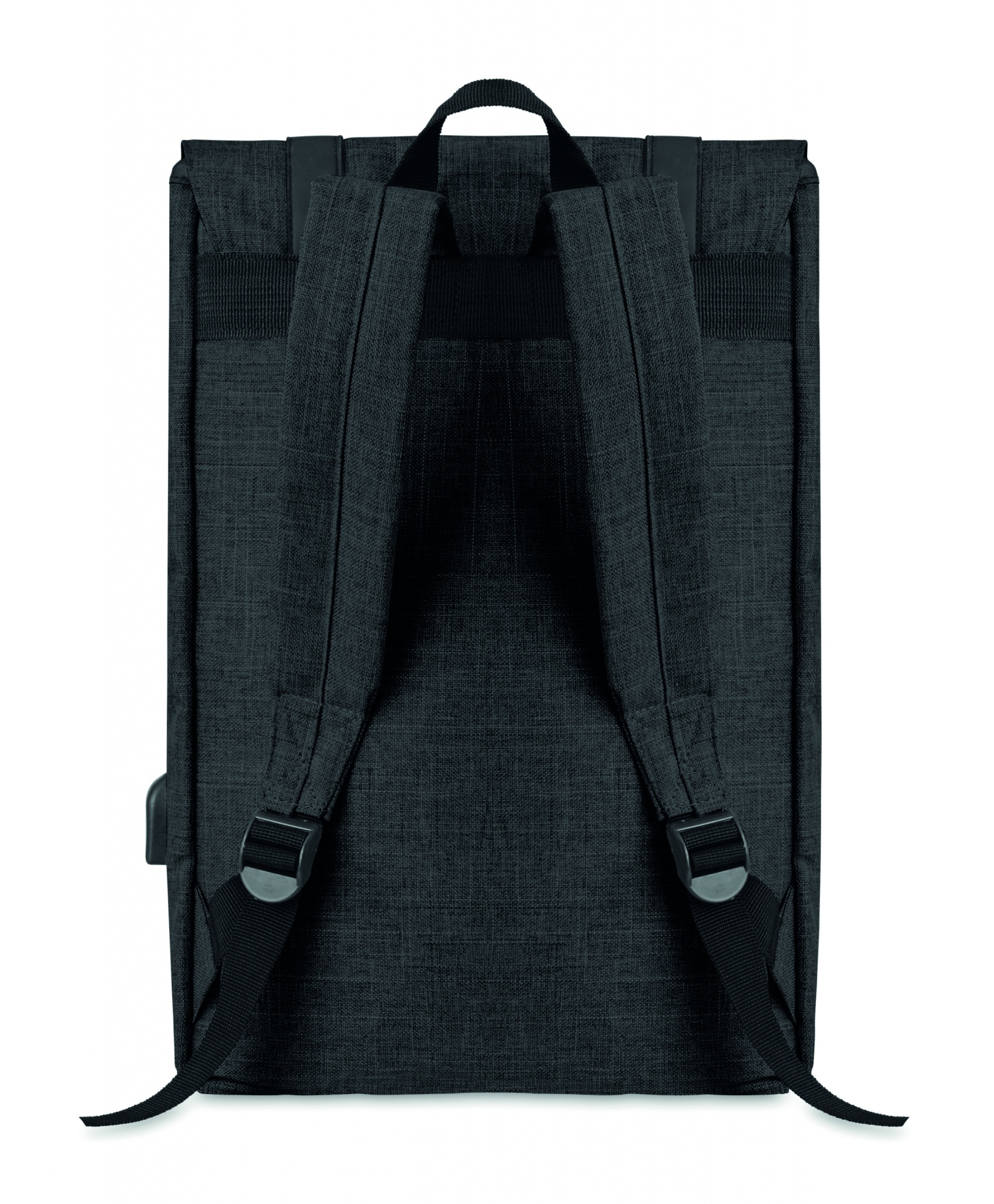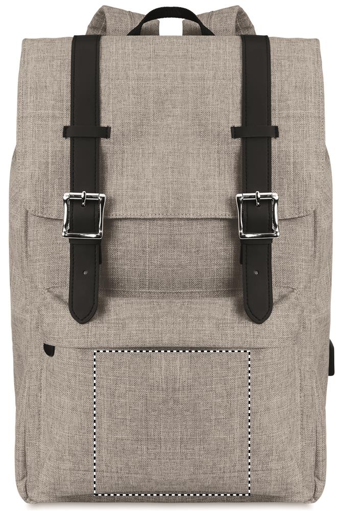 Laptop backpack in 600D 2 tone polyester with padded shoulder strap including one main internal compartment for 15 inch laptop and a USB charging cable. Includes magnetic snap button closure and one zippered front compartment.