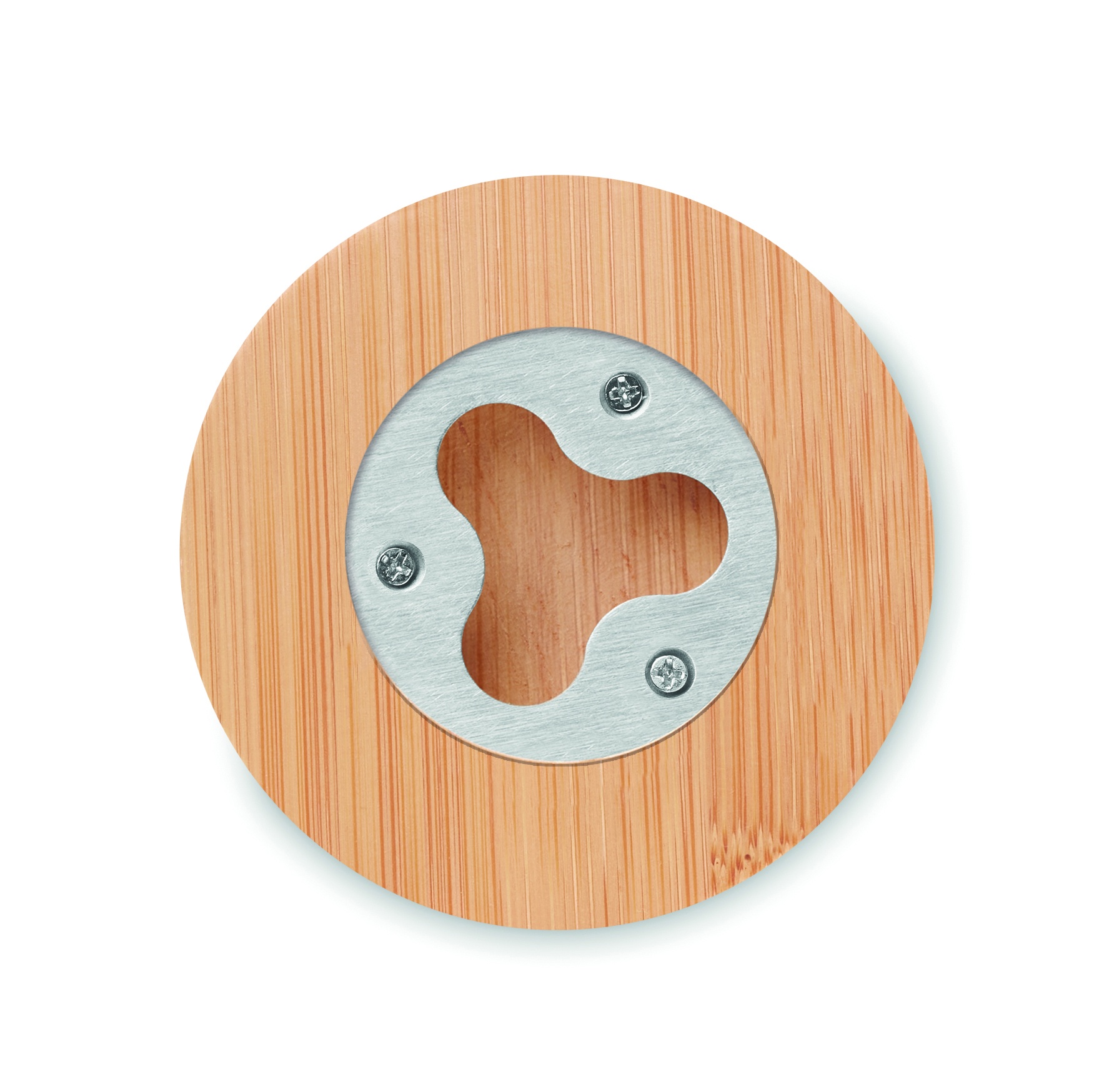 Bamboo bottle opener with coaster function. Bamboo is a natural product, there may be slight variations in colour and size per item, which can affect the final decoration outcome.