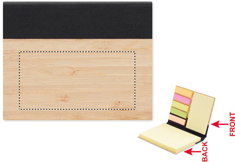 3 piece sticky note memo pad with bamboo hrd cover. Large and medium yellow sticky notes pads and 5 assorted colours page markers. Bamboo is a natural product, there may be slight variations in colour and size per item, which can affect the final decoration outcome.