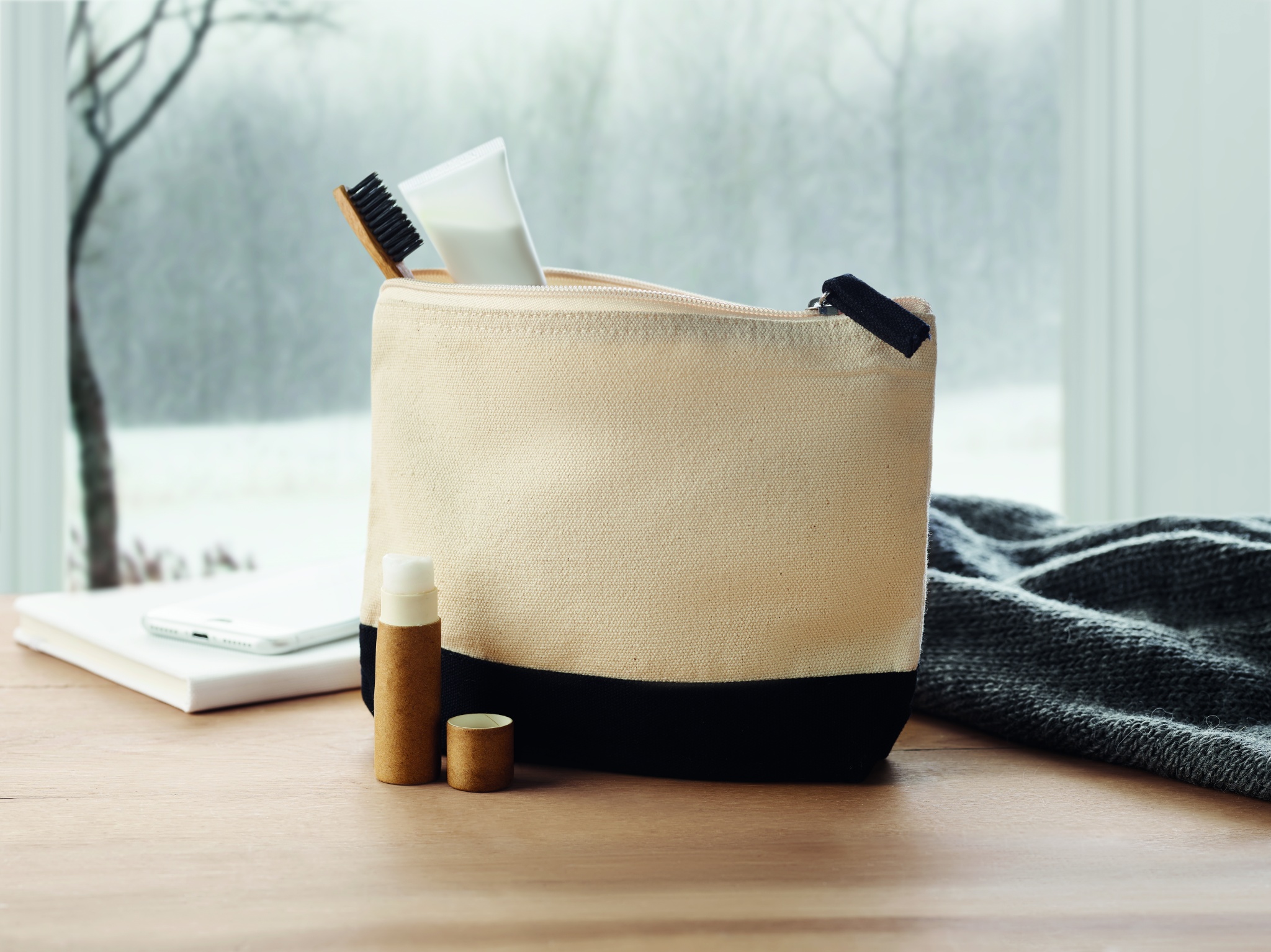 Cosmetic bag in cotton with coloured bottom and matching zipper puller. 340 gr/m².
