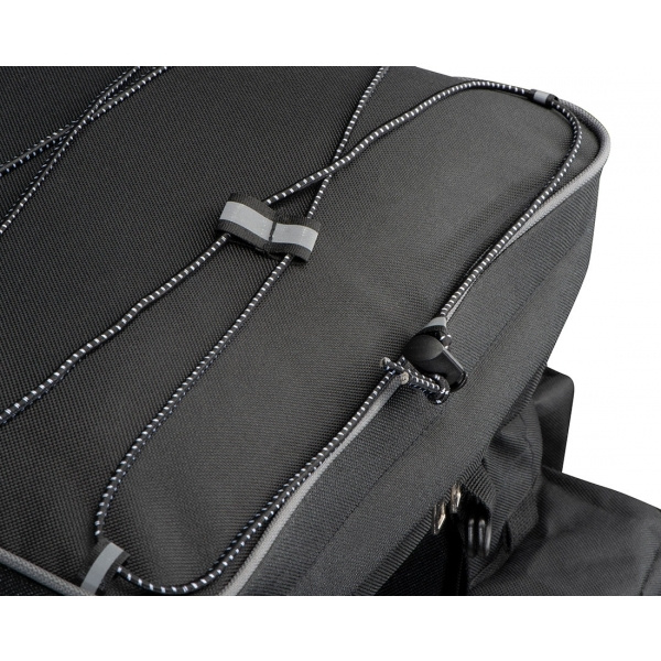 High-quality, large bicycle saddle bag that is attached to the luggage rack. With many functions such as elastic straps and several compartments to stow away. We will print your logo onto the bag.