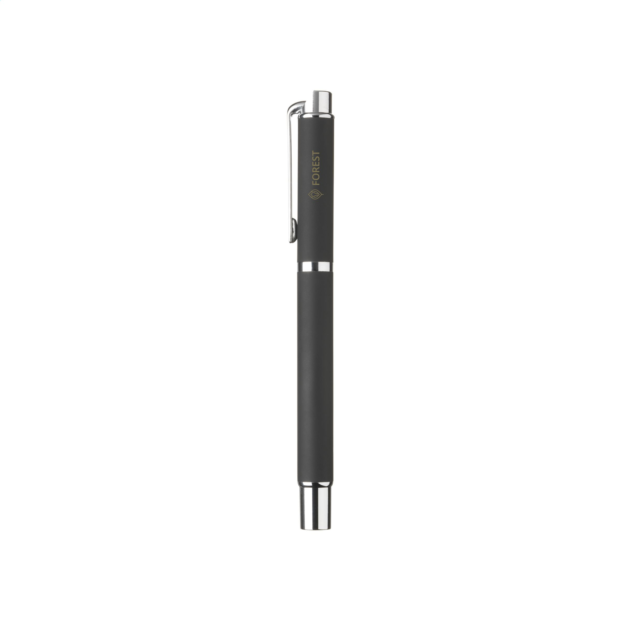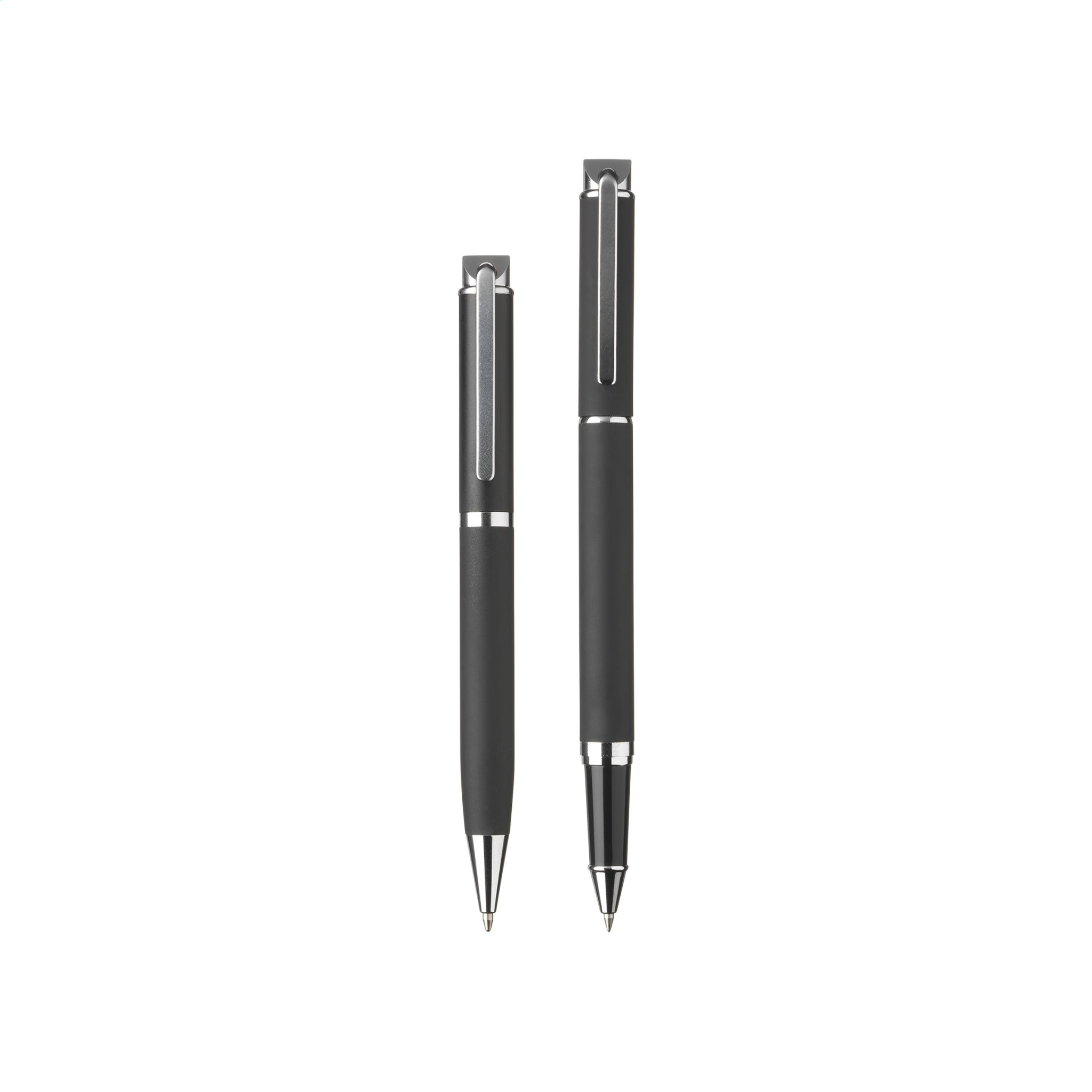 Metal writing set: blue ink pen and rollerpen. Both with stylish rubberised finish, beautifully designed top with clip and glossy accents. Items supplied as a set with, each set individually boxed.