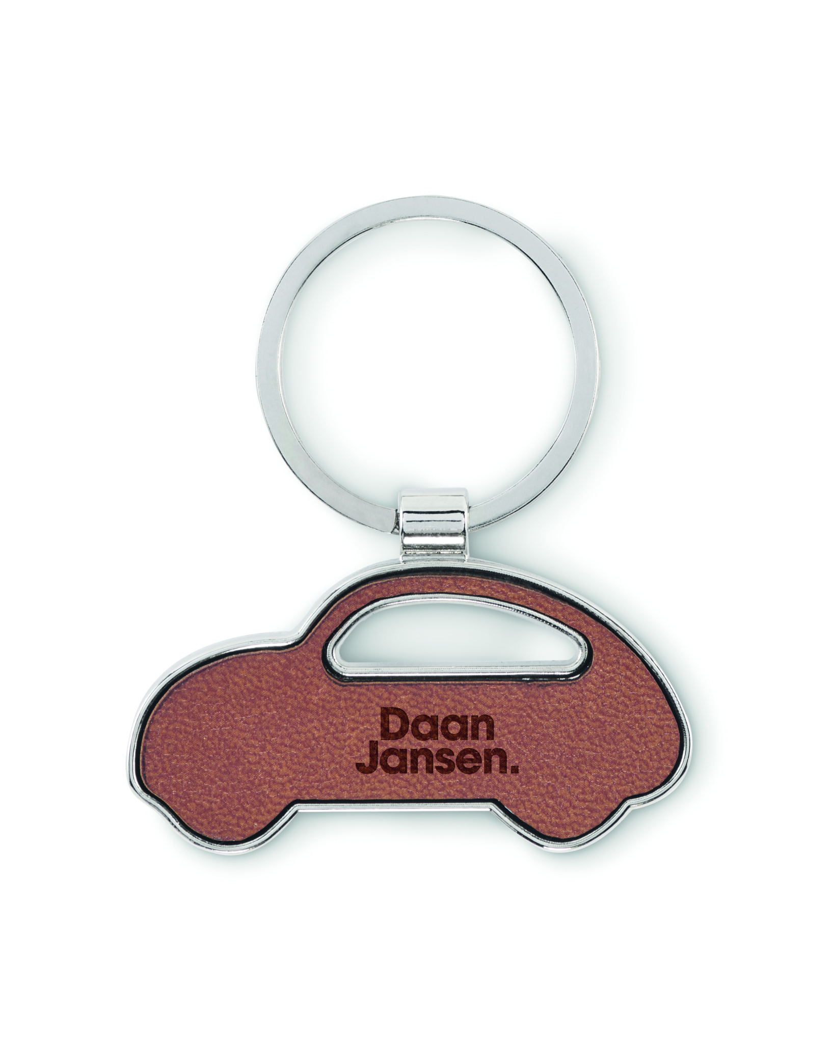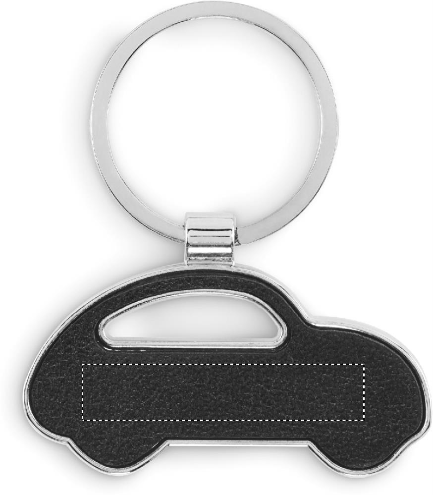 Car shaped metal key ring with recycled PU leather inlay.