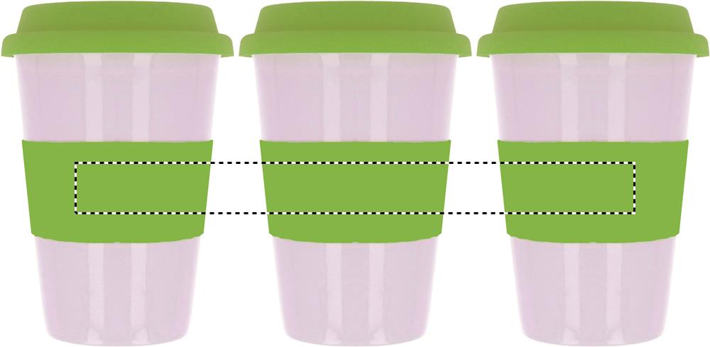 Single walled ceramic mug with silicone lid and wrap band. 400ml capacity. Ceramic transfer is dishwasher safe. As this is a single walled mug heat transfer can still occur.