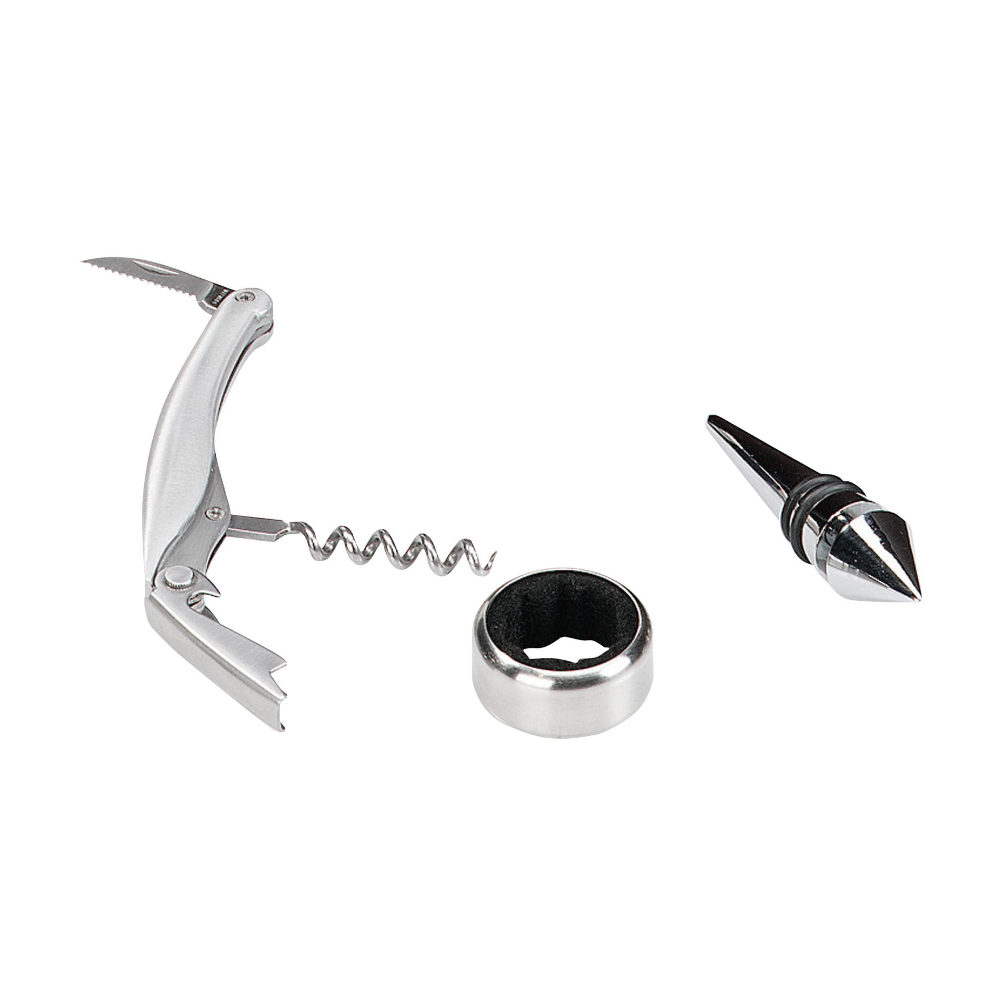 Elegant, wooden wine box with drip catcher, bottle stopper and stainless steel waiters friend. Excl. wine. Items supplied as a set in a brown cardboard box.