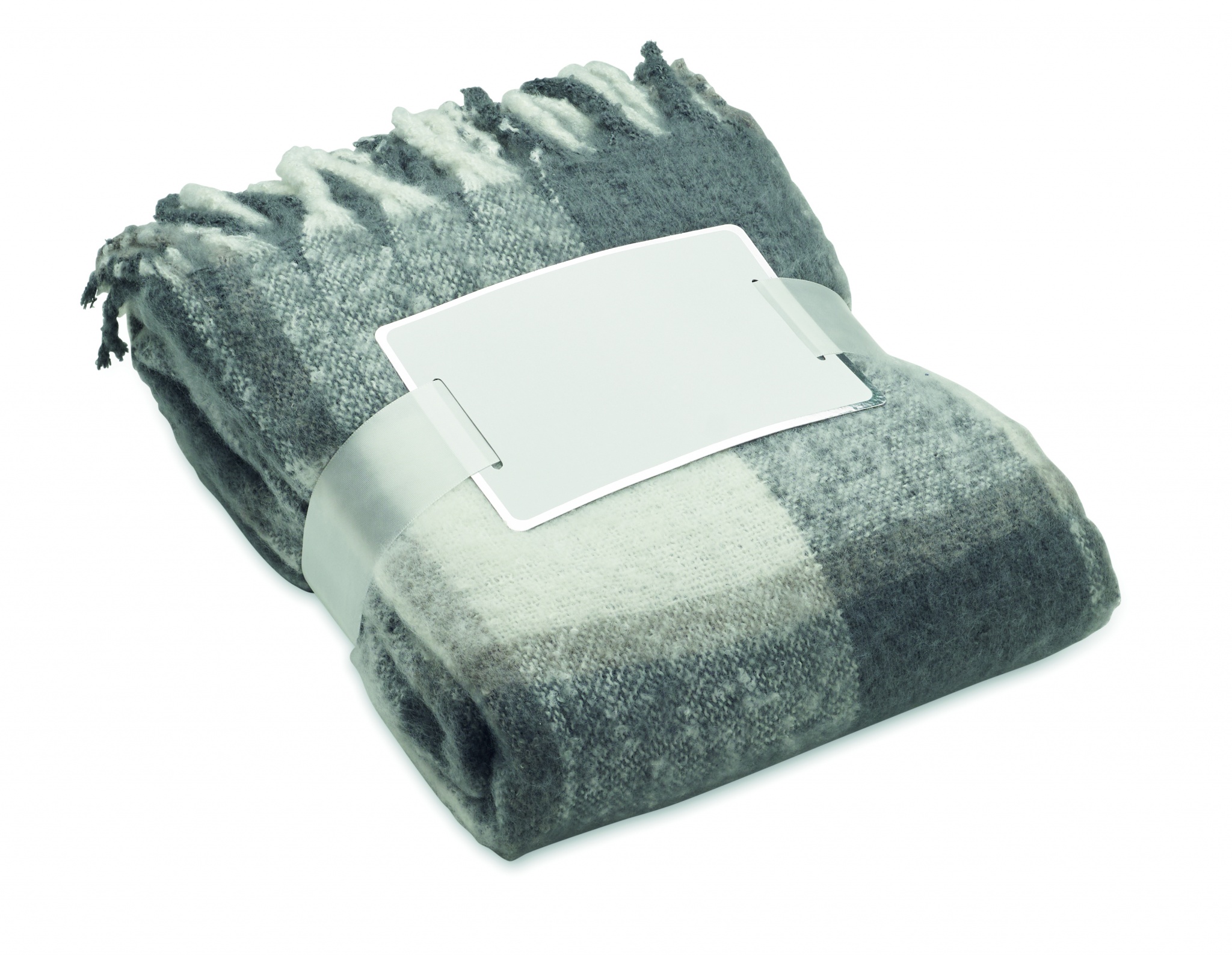 Chequered design mohair feel RPET polyester blanket with hand-rolled fringes. Wrapped in ribbon and printable card.