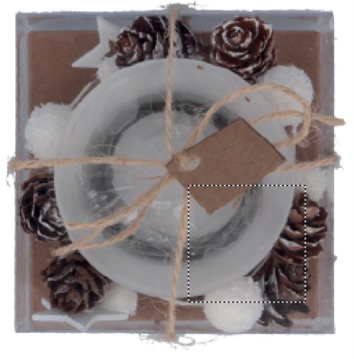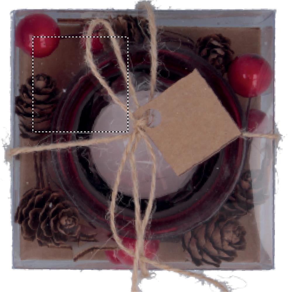 Glass candle holder surrounded via ornaments. Presented in a carton and PVC box with ribbon and label.