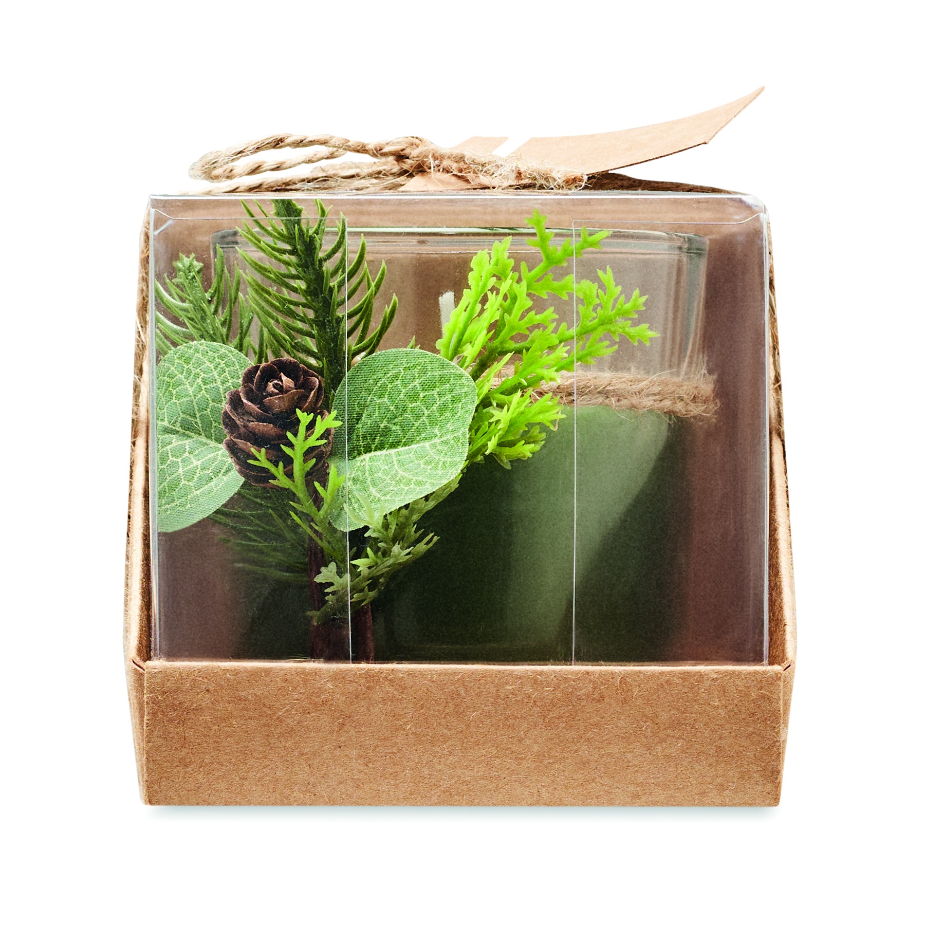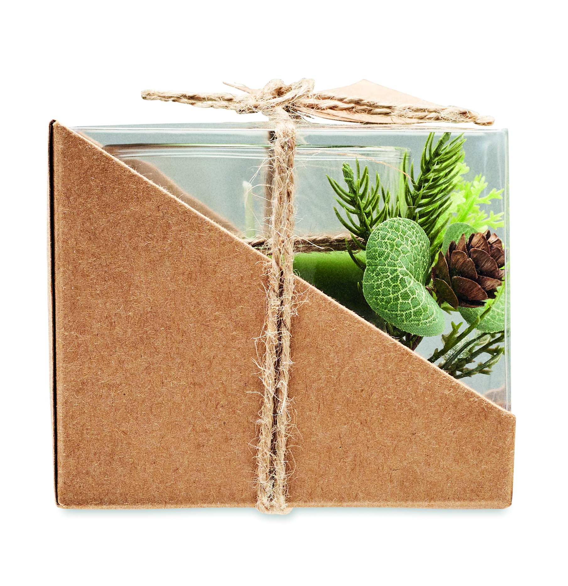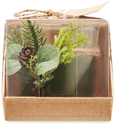 Glass candle holder (120 gr) with forest arrangement. Presented in a carton and PVC box with jute cord and kraft label. Candle included.