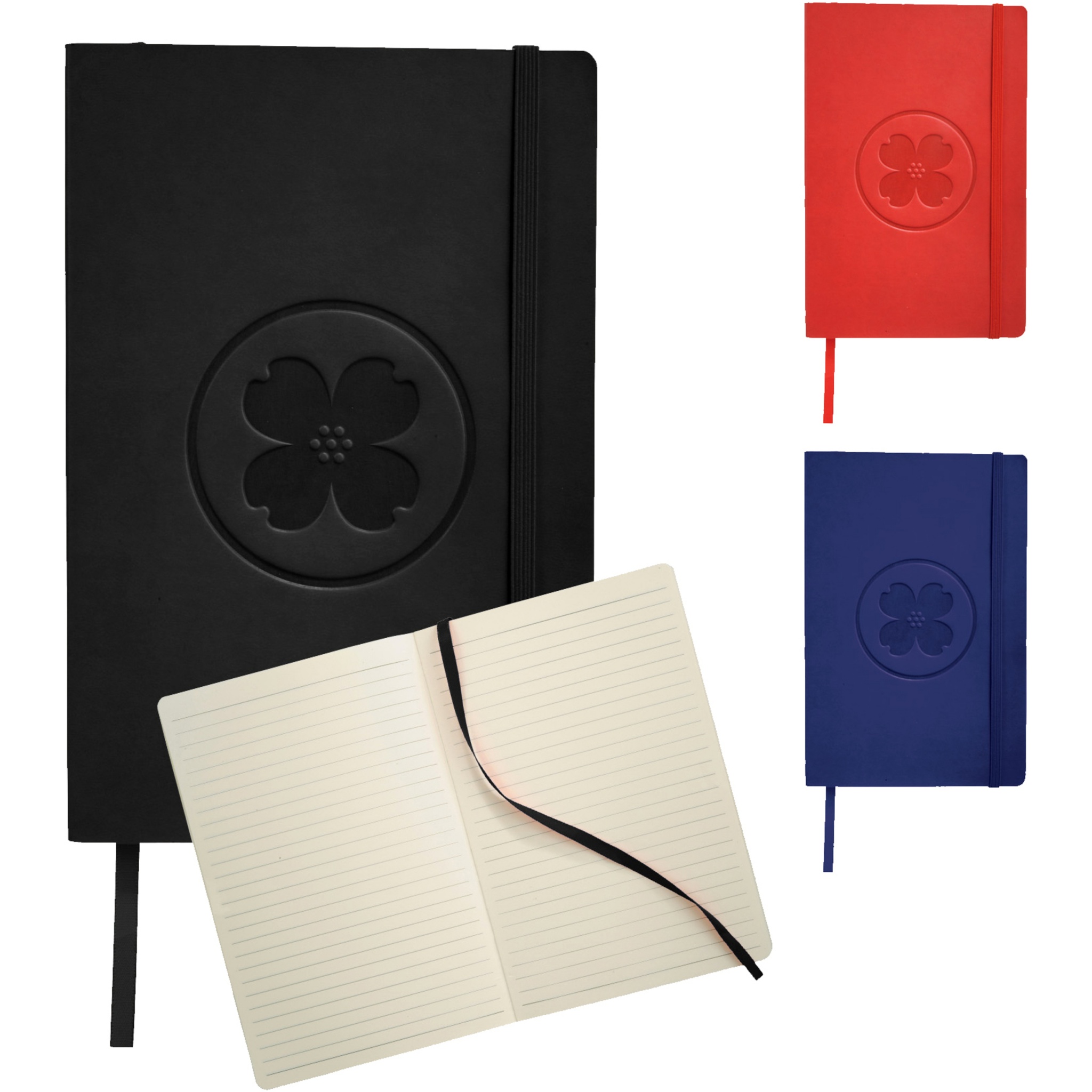Soft touch cover notebook (A5 size reference) with built-in elastic closure, ribbon page marker, document pocket on interior back cover and 80 sheets (80gsm) of lined paper.
