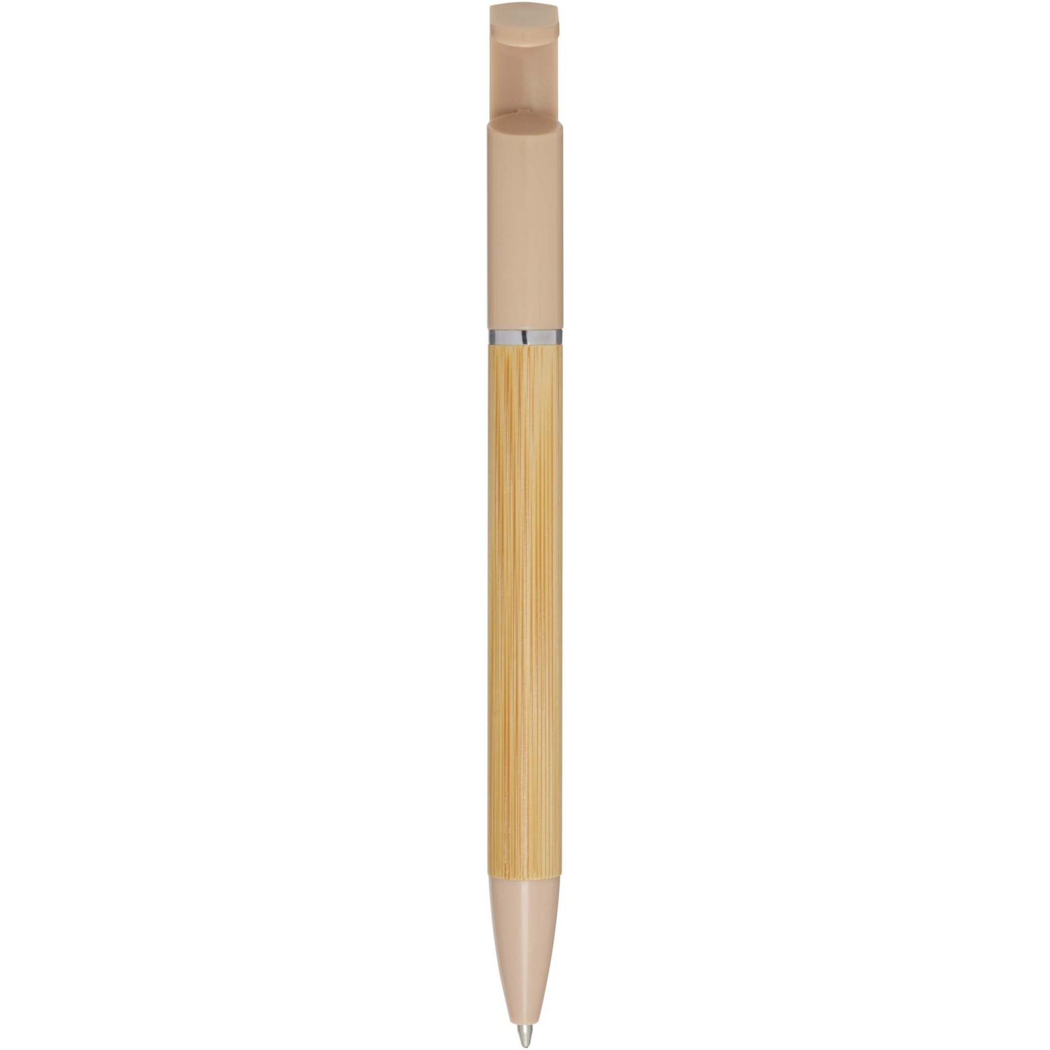 Bamboo ballpoint pen that also functions as a phone holder. The button and mid ring are made of recycled plastic, the tip is made of brass, and the barrel is made of responsibly sourced bamboo. Ink colour: Black. Writing length: 1000 metres. Nib size: 1.0 mm.