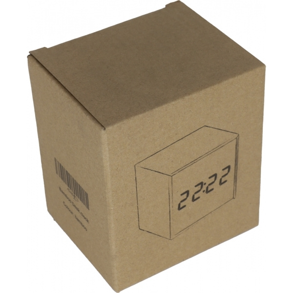 Elegant desk clock with wooden coating, black display space and blue LED letters, showing time, date and temperature by turns. Your logo will be engraved onto the top.
