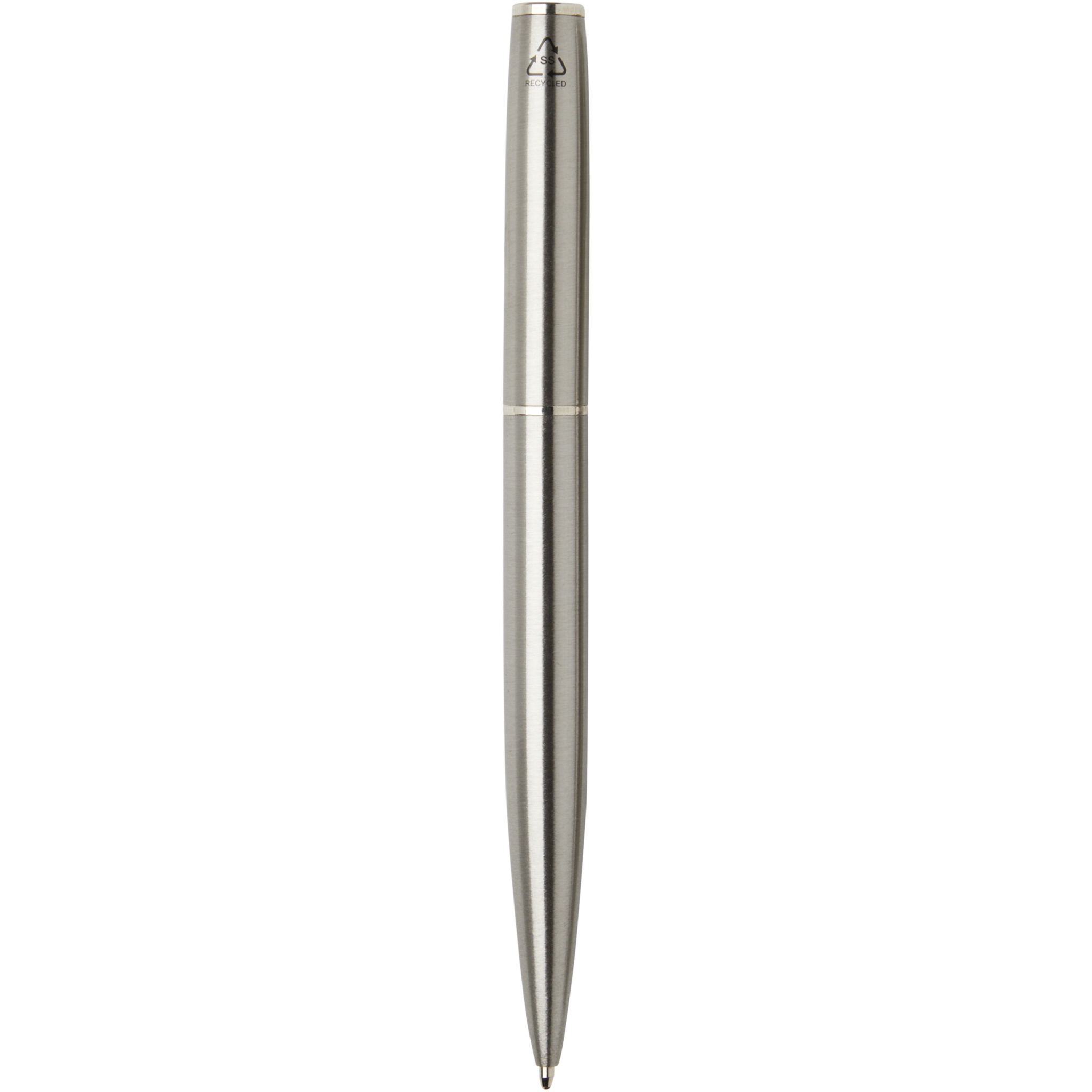 The Didimis ballpoint and rollerball pen set is made of recycled stainless steel. Opting for a recycled stainless steel pen contributes to reducing waste, making it a more sustainable choice. Pen ink colour: Black. Nib size: 1.00 mm. Writing length: 800 metres. Box size: 16.2 x 5.1 x 2.7 cm.