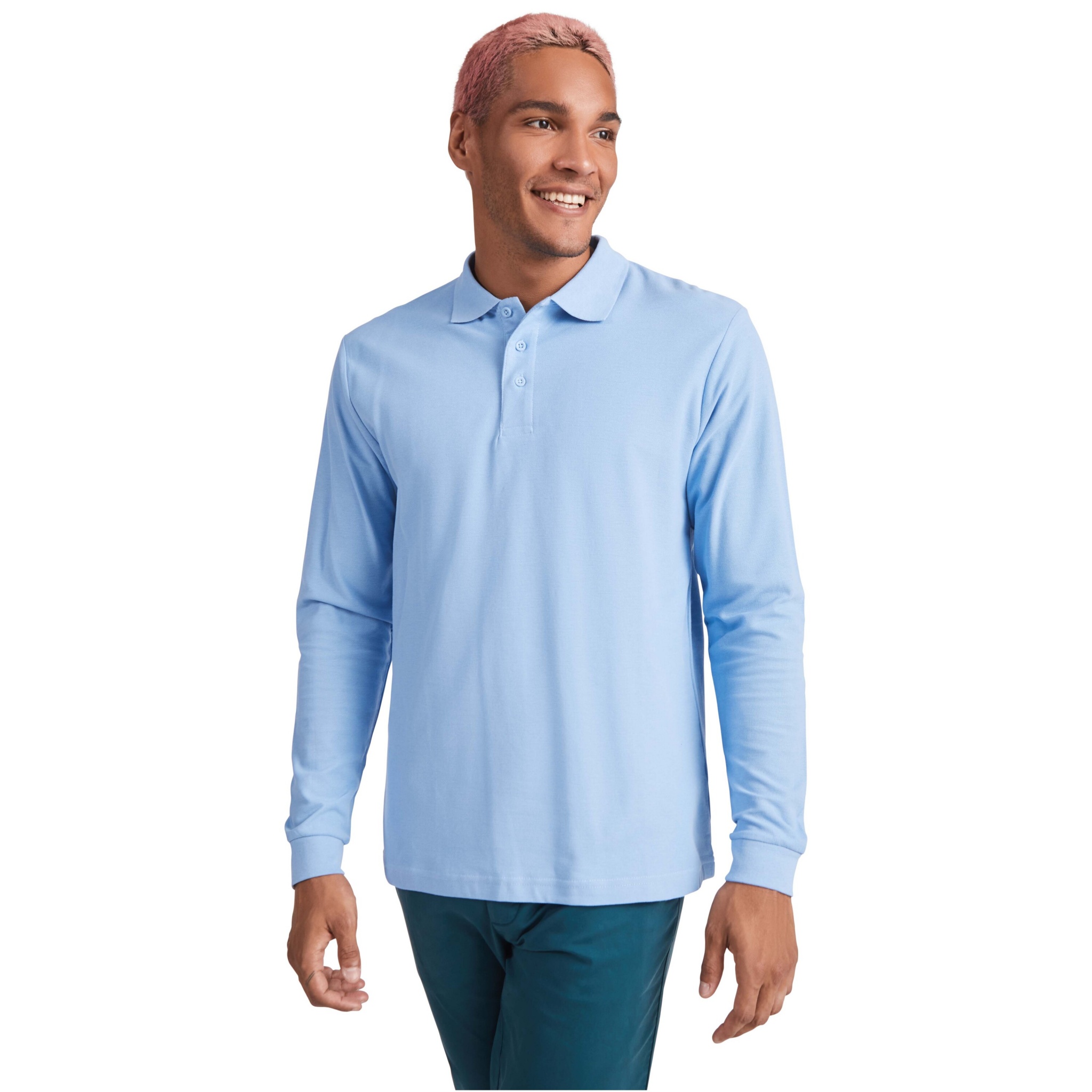 Long-sleeve polo shirt with ribbed collar and cuffs, 3-button placket and elastane 1x1 ribbed cuffs. Reinforced covered seams in collar. Optional pocket. Removable label. The model is 190 cm and is wearing size L.
