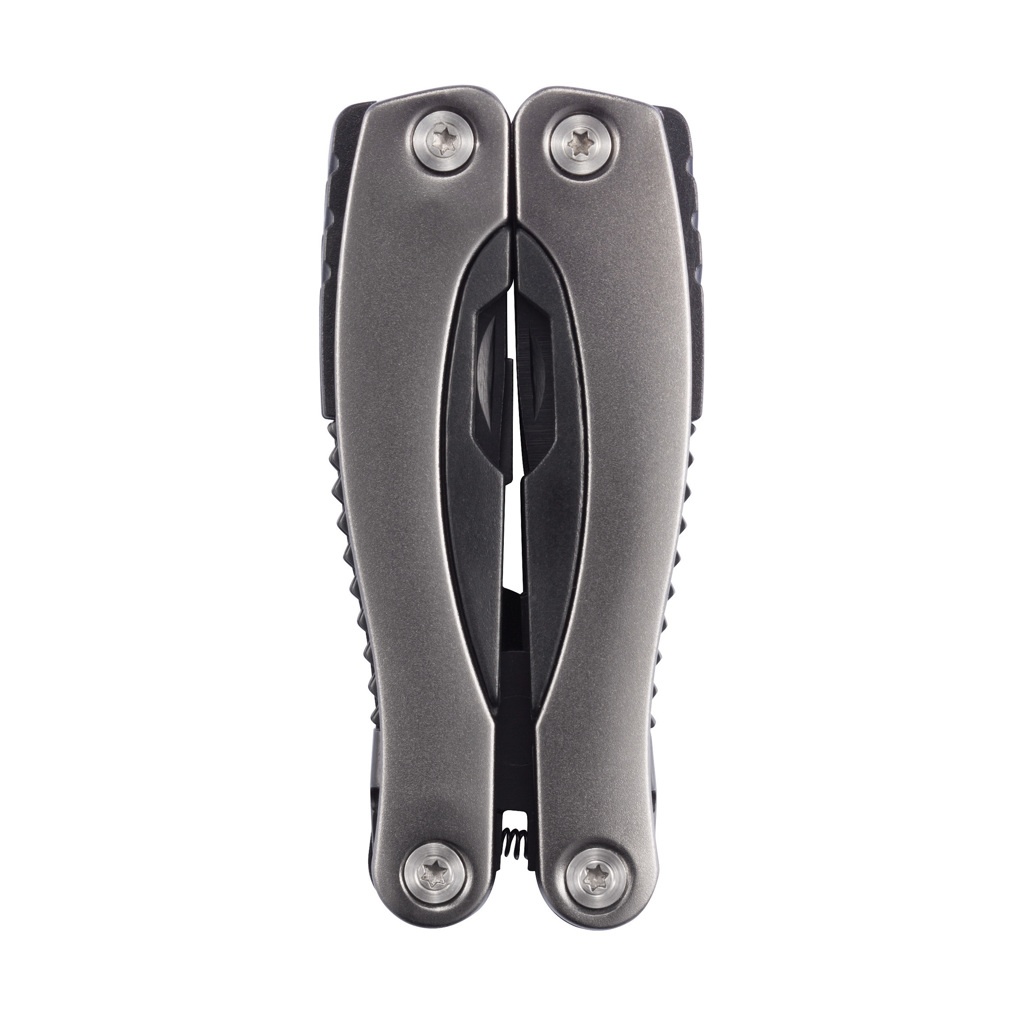 14 functions, black stainless steel multitool with aluminium anodised handle. Including black pouch.