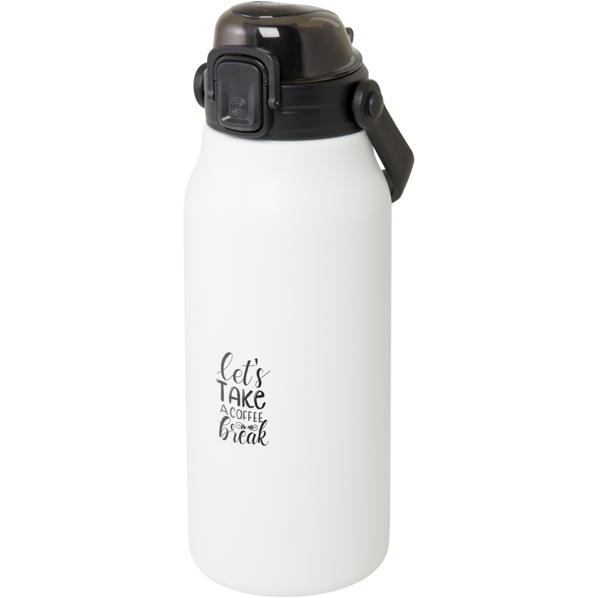 This large RCS certified recycled stainless steel bottle will keep you hydrated throughout the day in style. The copper vacuum insulation will keep drinks hot or cold for several hours, and the with its folding handle it is easy to carry around. The bottle is leakproof and features an easy button opening mechanism. Volume capacity is 1600 ml. Presented in a recycled cardboard gift box.