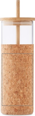 Borosilicate glass tumbler with cork protective sleeve and bamboo lid and straw. Capacity 450 ml. As this is a single wall mug heat transfer can still occur. Bamboo is a natural product, there may be slight variations in colour and size per item, which can affect the final decoration outcome.
