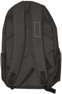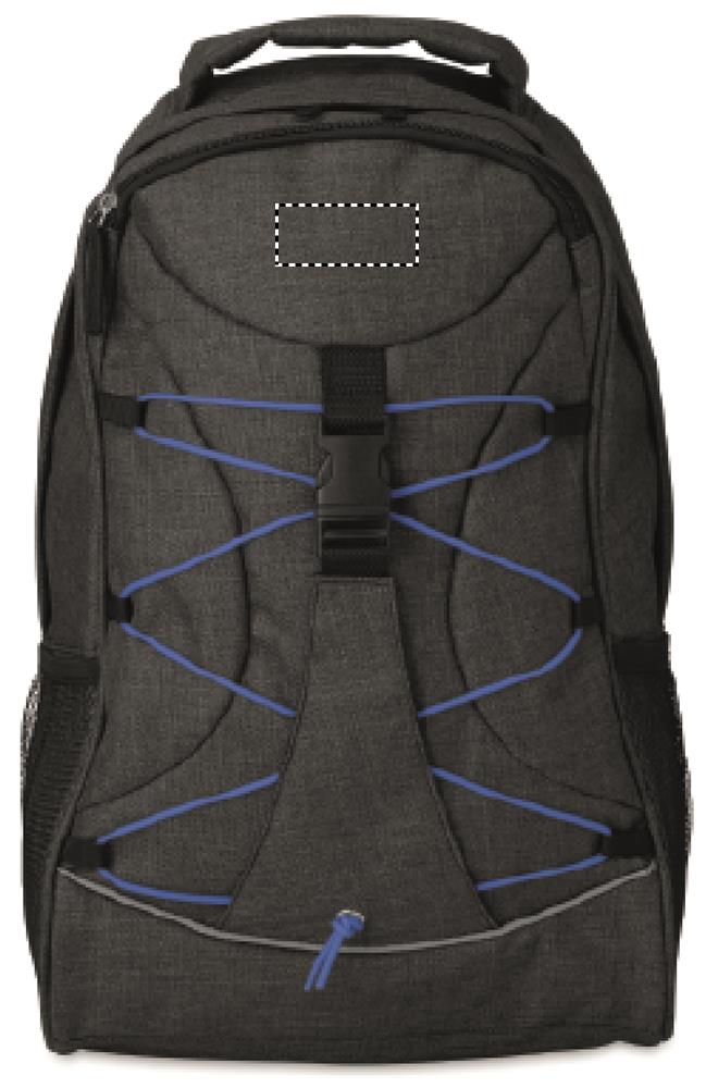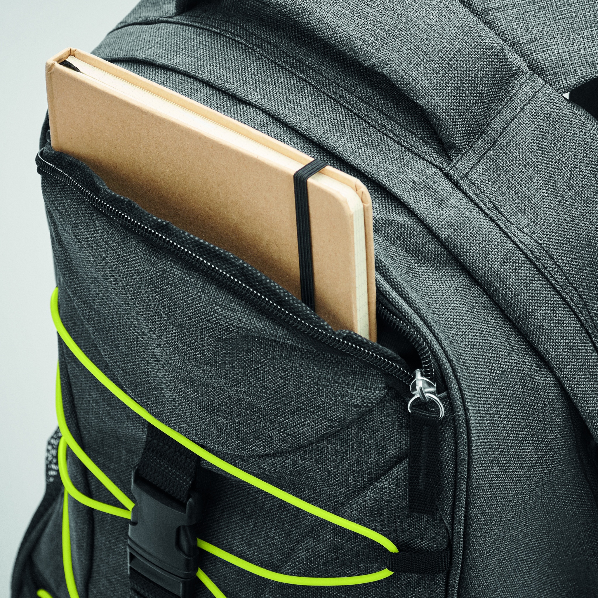 Backpack in 600D 2 tone polyester with colourful contrasting facing and glow in the dark cord on the front panel. Mesh pockets on both sides.