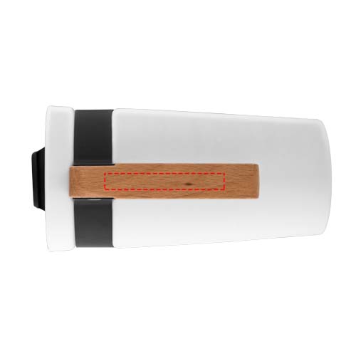 A must-have ceramic tumbler. Matte finish body and natural wooden handle are combined by the black coated stainless steel band. Push-on, slide lock lid included. Volume capacity is 475ml. Presented in a gift box.