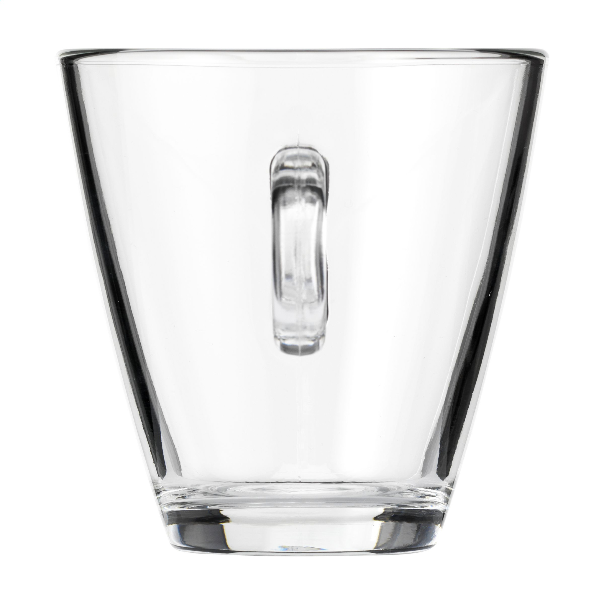 Large tea glass made from high-quality, hardened glass. Timeless model with a curved handle. Capacity 320 ml. Made in Italy.