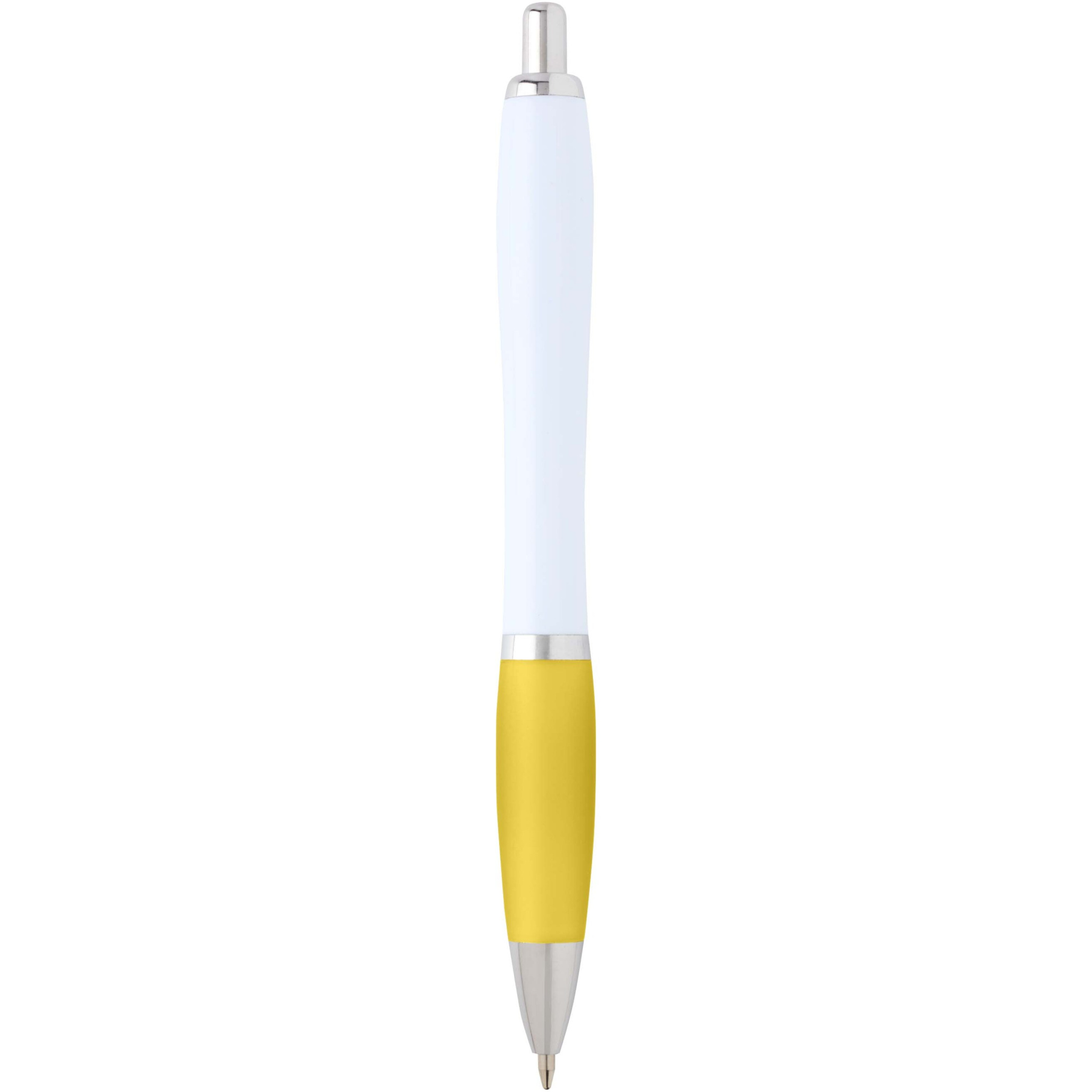 The Nash ballpoint with a stylish curvy design and a soft grip is made of recycled plastic that is hard and solid and thus offers a long life span. Ink colour: Black. Writing length: 1000 metres. Nib size: 1.00 mm.