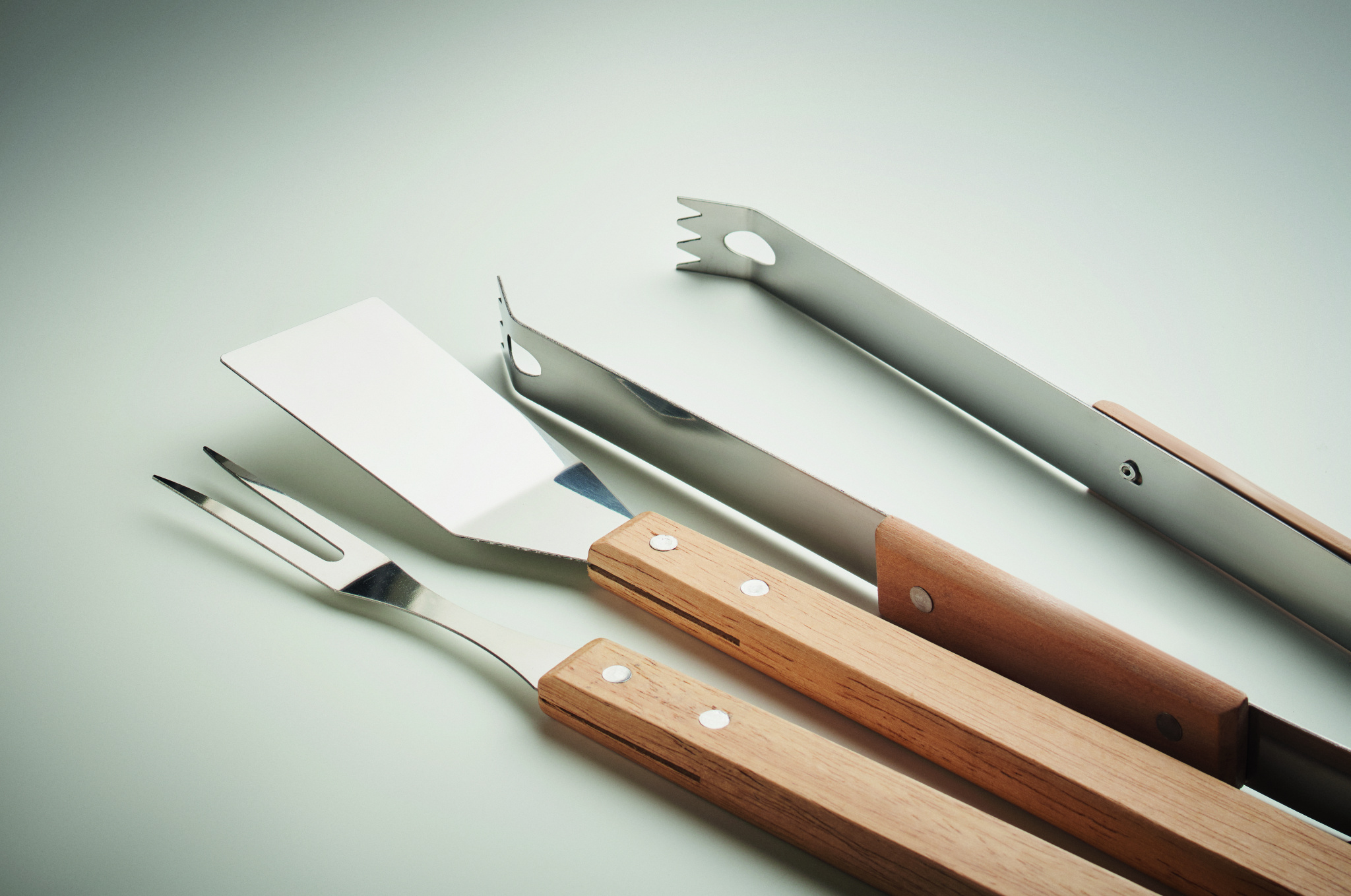 Set of 3 stainless steel barbecue tools: shovel, fork and clip with oakwood handle. Presented in kraft box with lid.