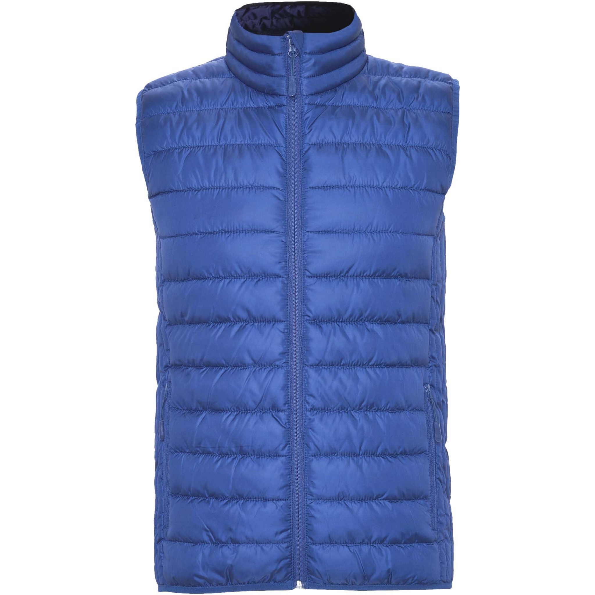 Gilet vest with feather touch filling. Inverted zips with matching chin protector and puller. Two side pockets with zip. Elastic trim in hem and armholes. Contrasting inner lining. Light and foldable garment. Water resistant. Wind-proof model.