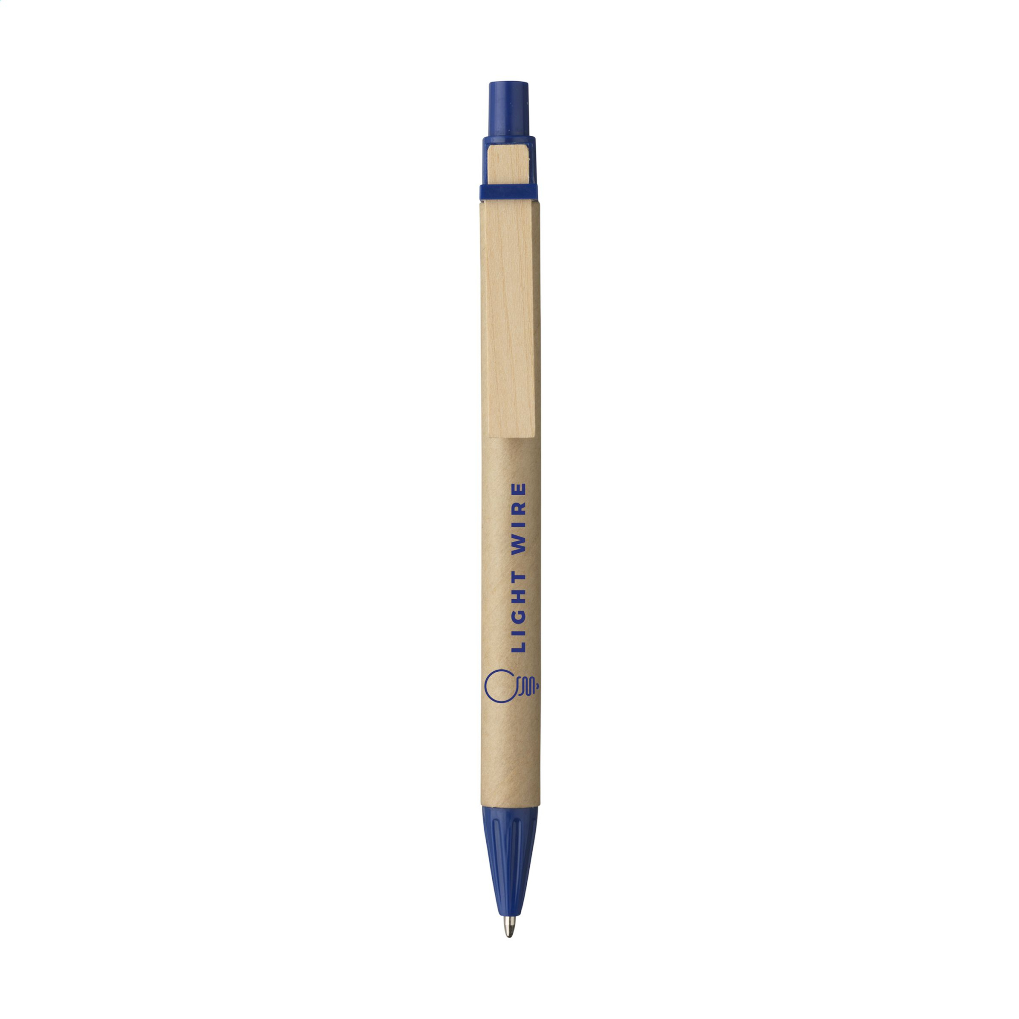 WoW! Blue ink ballpoint pen with holder made from recycled cardboard, wooden clip and coloured plastic accents.