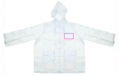 PVC rain jacket (one size XL) transparent frosted with hood, two front pockets and snap buttons. We will print your logo on the chest (heart side).