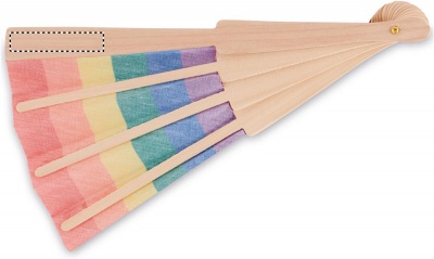 Manual hand fan in wood and polyester fabric with rainbow pattern.