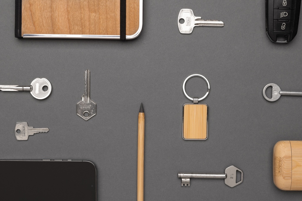 Rectangle shape keychain made with RCS recycled zinc alloy and bamboo. Total recycled content: 76 % based on total item weight. RCS certification ensures a completely certified supply chain of the recycled materials. Packed in paper bag.