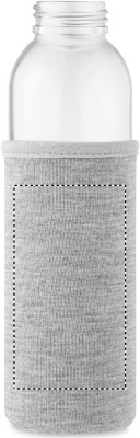 Recycled glass bottle with neoprene pouch and PP lid with silicone hanger. Leak free. Capacity: 500 ml.