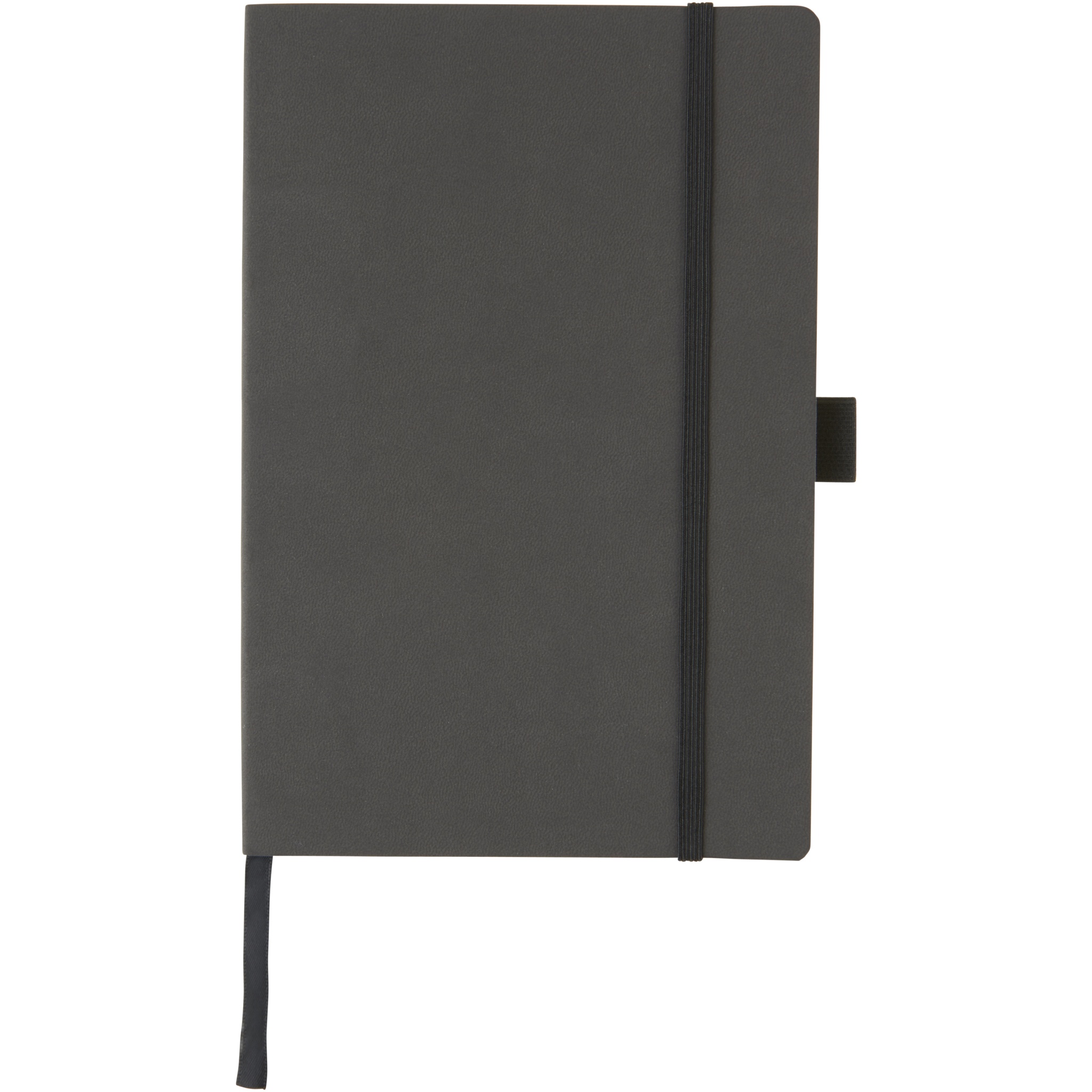 Flexible soft touch cover notebook (A5 size reference) with built-in elastic closure, ribbon page marker, pen loop, document pocket on interior back cover and 80 sheets (80gsm) of cream lined paper. Packed in a black sleeve.